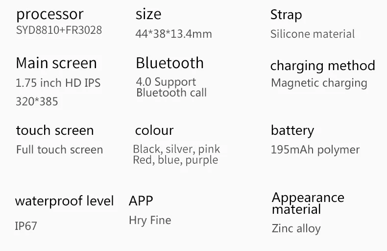Пожалуйста, сообщите мне цвет, который вам нужен после оформления заказа, он может быть смешан, спасибо!Модель: X8 MaxЦвет: черный, белый, розовый, красный, синий, фиолетовыйПриложение: HryFineНабор микросхем: SYD8810 + FR3029Совместимая система: Android 5,0 и выше IOS9.0 и вышеЭкран Размер: 1,75 дюймовРазрешение: IPS 320*385Тип: Полное касаниеУровень водонепроницаемости: IP67 (только ежедневное использование, без купания/дайвинга и так далее)Внешний вид Материал: цинковый сплавОсновные функции: Ищу мобильный телефон, запись звонков, Facebook, напоминание о сидячем положении, набор номера, фонарик, загрузка приложения qr-кода, проверка температуры тела, подсчет шагов, Bluetooth музыка, удаленное фото, переключение стиля меню, яркость, переключение языка, Twitter, информация, бег, мониторинг сна, будильник, Секундомер, кровяное давление, езда, выключение, альпинизм, скакалка, пульс, телефонная книга, погода.Особенности программного обеспечения: Ищу мобильный телефон, запись звонков, Facebook, напоминание о сидячем положении, набор номера, фонарик, загрузка приложения qr-кода, проверка температуры тела, подсчет шагов, Bluetooth музыка, удаленное фото, переключение стиля меню, яркость, переключение языка, Twitter, информация, бег, мониторинг сна, будильник, Секундомер, кровяное давление, езда, выключение, альпинизм, скакалка, пульс, телефонная книга, погода.Язык часов: Поддержка сообщений пользовательского интерфейса: английский, упрощенный китайский, итальянский, португальский, польский, испанский, французский, греческий, персидский, венгерский, чешский, русский, турецкий, голландский, немецкий, тайский, вьетнамский, индонезийский, малайский, филиппинский, арабский, иврит, финский и украинскийЯзык приложения: английский, упрощенный китайский, итальянский, португальский, польский, испанский, французский, греческий, персидский, венгерский, чешский, русский, турецкий, голландский, немецкий, тайский, вьетнамский, индонезийский, малайский, филиппинский, арабский, иврит, финский и украинский.