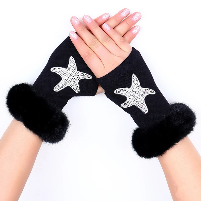 Женские и мужские теплые сверкающие вязаные перчатки для девочек и мальчиков из черной шерсти с полупальцами, модные женские перчатки без пальцев, стразы