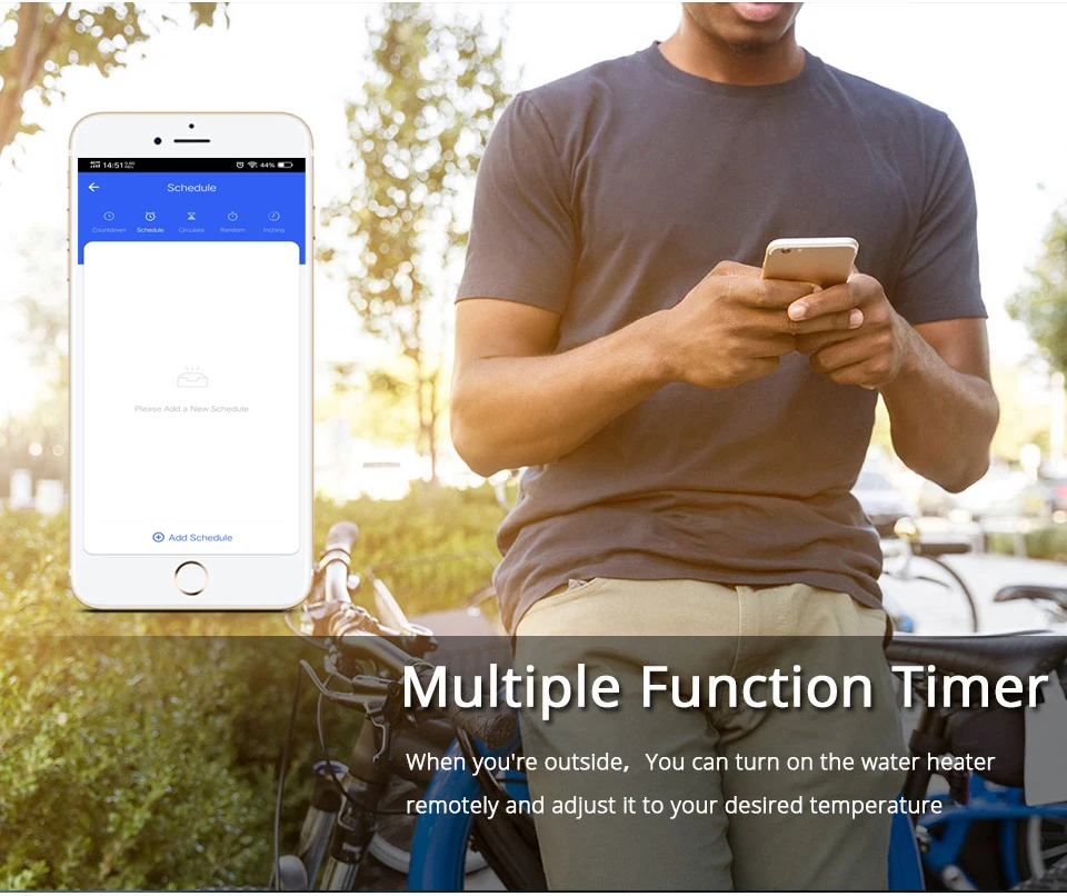 Вы можете установить 1 или более таймер, чтобы сделать бойлер включенным/выключенным автоматически, или работать в течение определенного периода времени, а затем автоматически закрыть.-Обратный отсчет-Расписание-Циркулирует-Случайный-Вход: Включение функции сделает устройство в автоматическом состоянии: после открытия устройства каждый раз, оно автоматически закроется после работы в течение определенного периода времени.