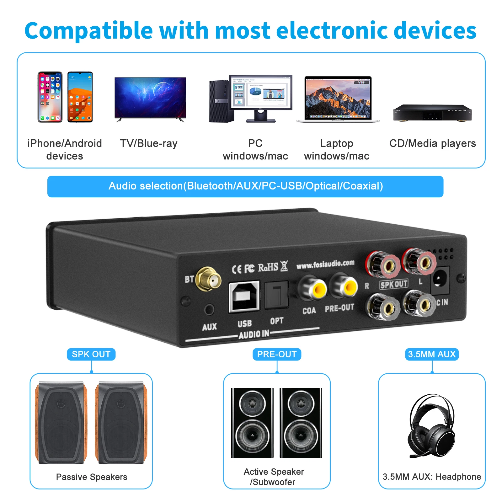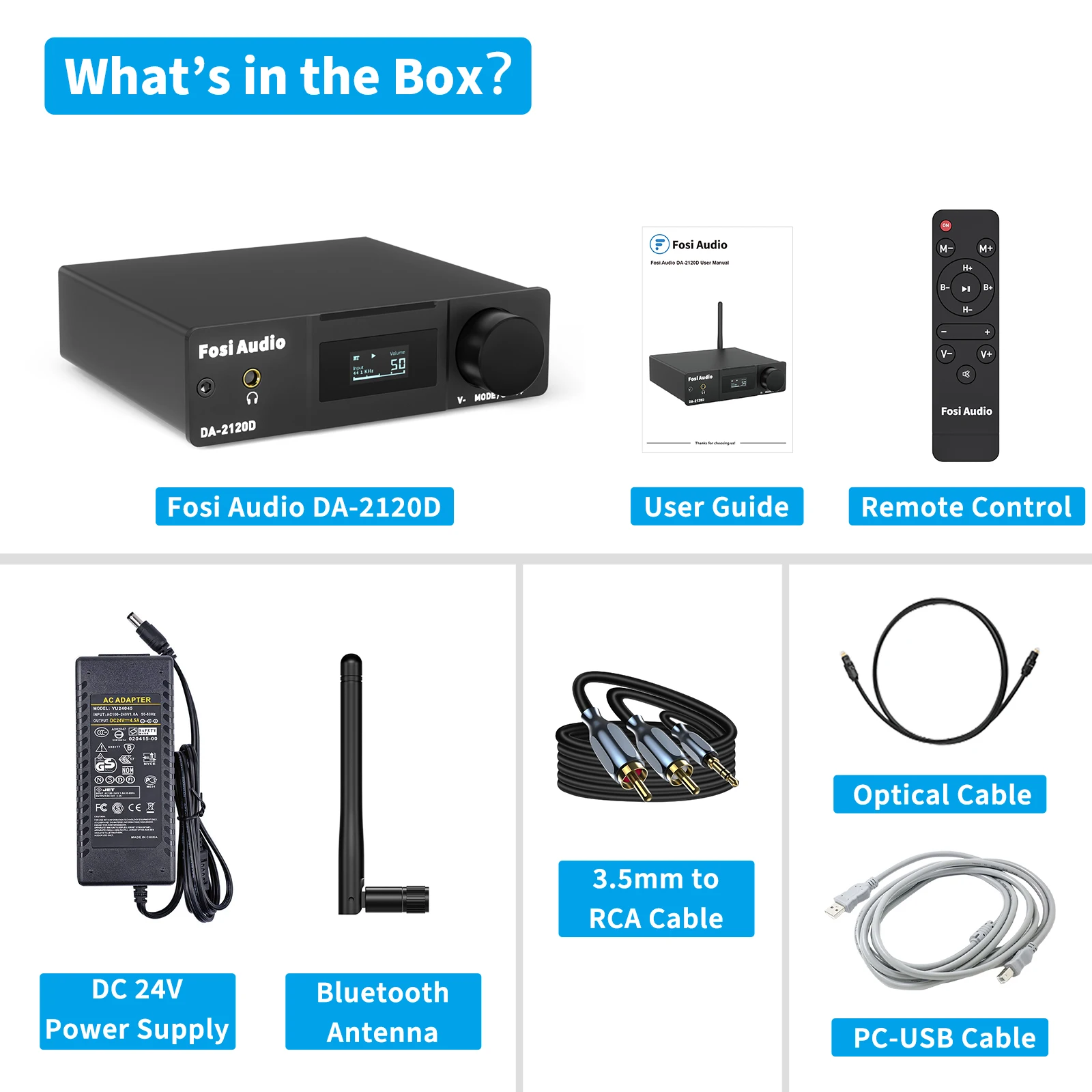 Fosi Audio DA-2120D-это аудио усилитель Bluetooth 5,0 для пассивных динамиков, который оснащен стереозвуком мощностью 100 Вт x2. DA-2120D представляет собой 2,1 канал Мощность ЦАП усилитель, который оснащен Bluetooth, PC-USB, коаксиальный, оптический, и 3,5 мм вспомогательный вход. Пульт дистанционного управления для переключения громкости, басов и режимов.