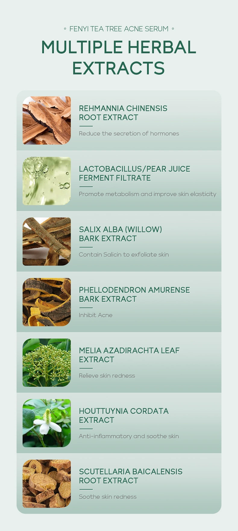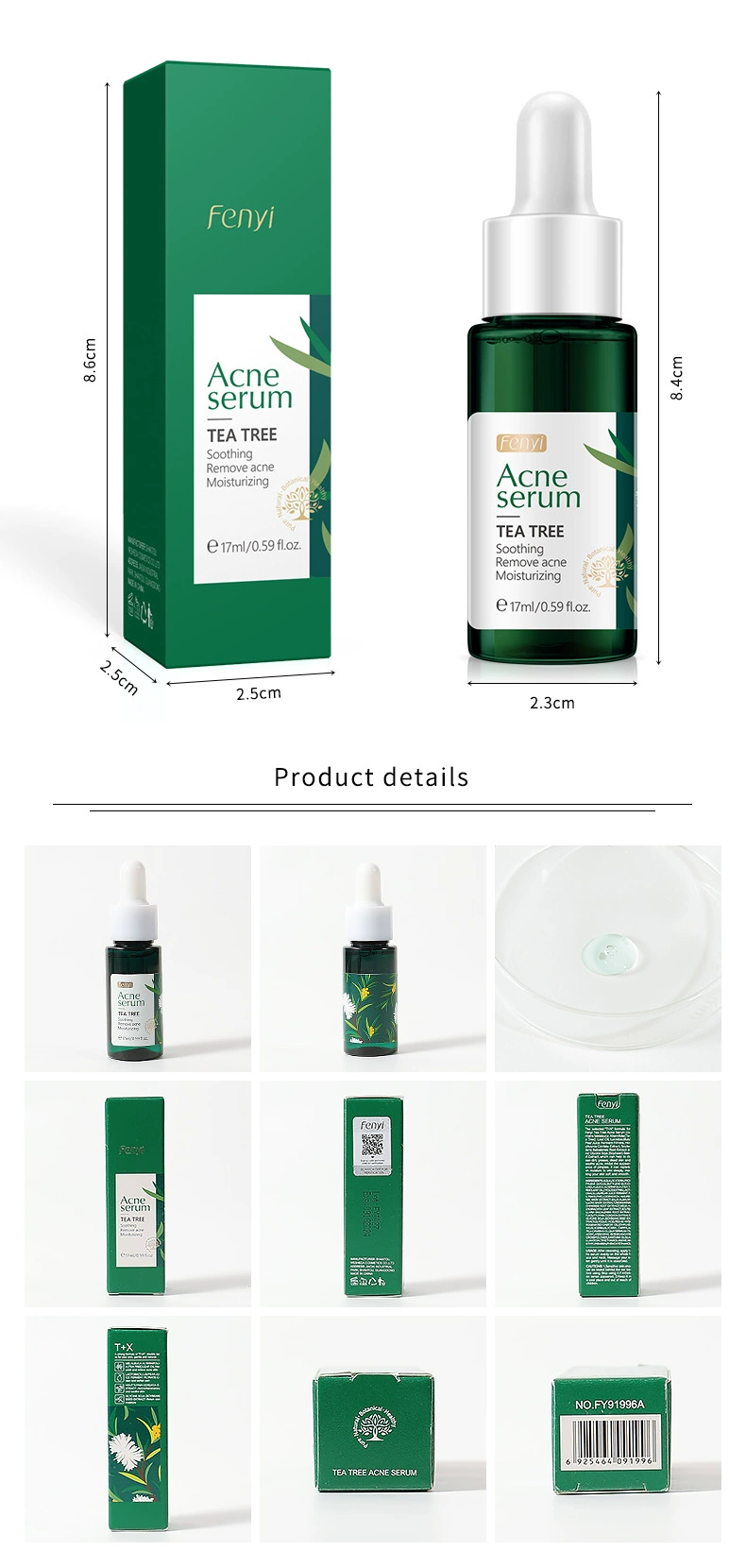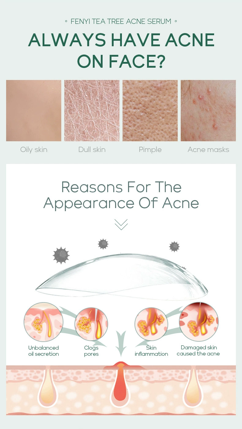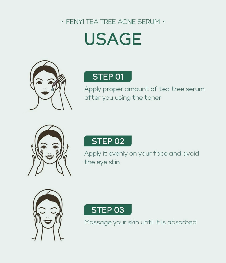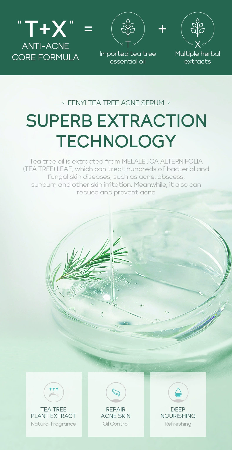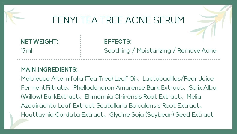 Выбранная формула «T + X» для сыворотки угрей чайного дерева Fenyi содержит масло листьев мелалеуки альтернифолии (чайное дерево), лактобактерию/фермент грушевого сока, экстракт корданных Houttuynia, экстракт корня Baicalensis Scutellaria и экстракт семян глицина сои (СОИ), который может помочь очистить грязь, жир, омертвевшую кожу и успокоить акне, Препятствует появлению прыщей. Он может глубоко впитывать влагу, делая вашу кожу мягкой и гладкой.