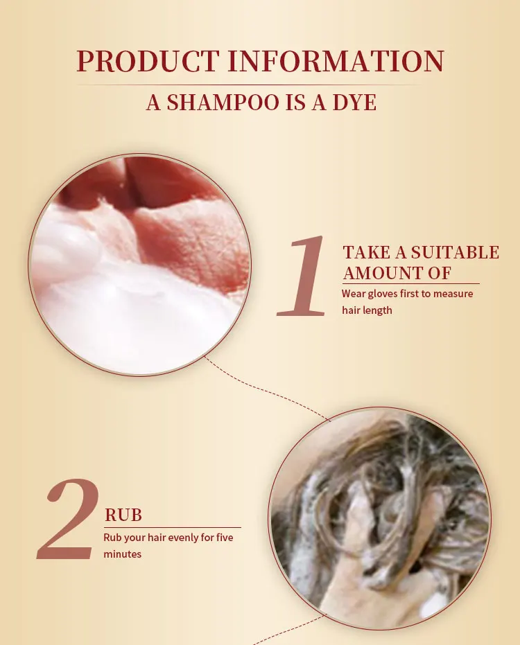 1. Намочите волосы и вытрите воду на волосах. (убедитесь, что волосы высыхают на 100%)2. Надевайте салфетки (внутри) перед открытием черного шампуня для волос.3. Используйте шампунь для окрашивания волос и нанесите на волосы.4. Хорошо массируйте волосы в течение 5 минут, пока шампунь не будет равномерно распределен на кожу головы.5. Хорошо впитывает краску водой.