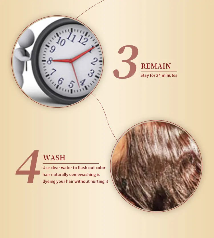 2. Когда вы начинаете окрашивать волосы, убедитесь, что волосы сухие. Когда делаете краску для волос, не добавляйте воду, после того как сделали краску для волос, затем можно мыть волосы водой.3, для черного цвета, обычно требуется 5-10 минут, если другие цвета, то нужно время 30-40 минут. Затем можно мыть волосы.