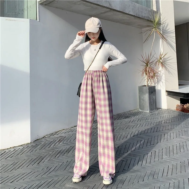 Женские клетчатые брюки в стиле Харадзюку, широкие брюки большого размера, женская пижама в клетку с высокой талией в Корейском стиле, весна-осень 2022