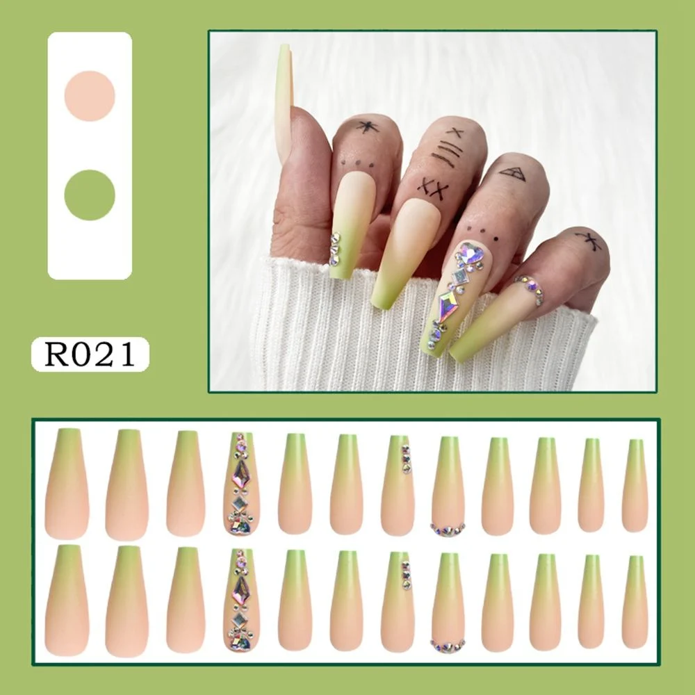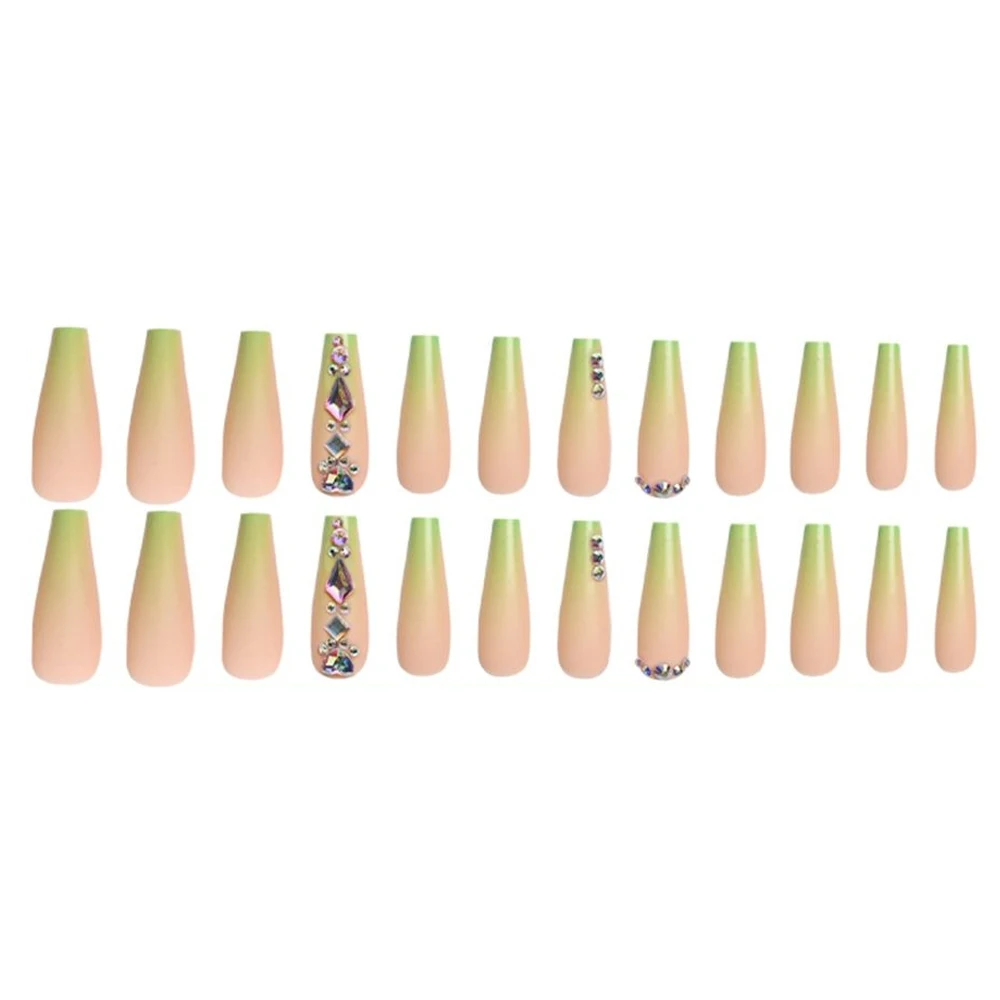 Весна 2022, новинка, накладные ногти розового и зеленого цвета, накладные ногти балерины с дизайном стразы, патчи для французского маникюра