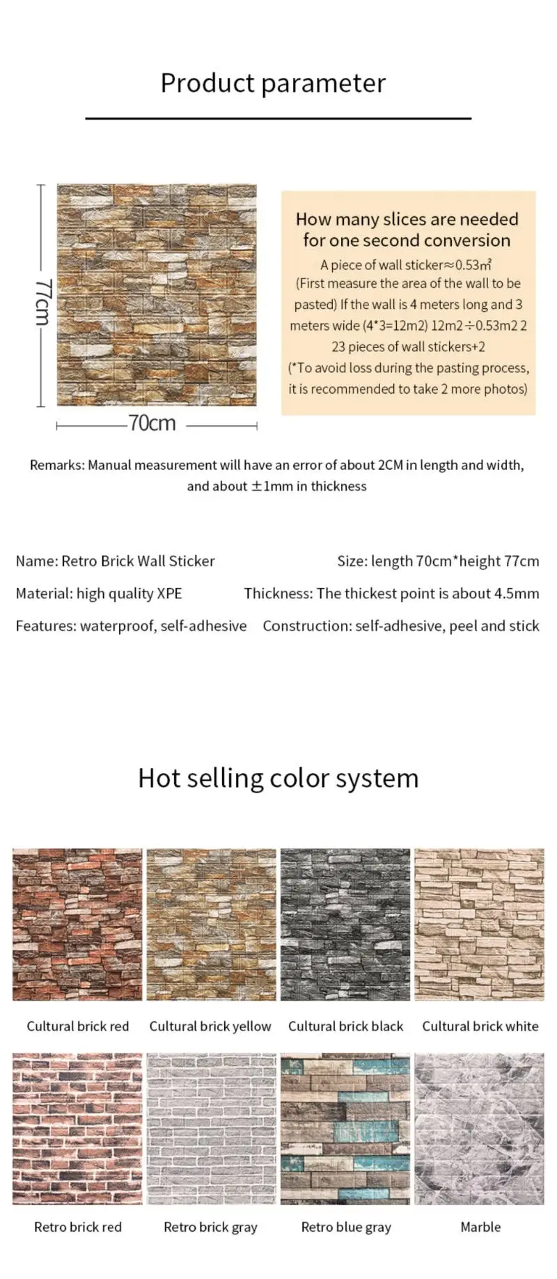 A. Мягкая и мягкая PE пена: 3D стеновые панели кирпичная конструкция PE настенная панель из полиуретановой пены, Размер блока: 1,25 футов x 1,15 футов (38 см x 35 см). По сравнению с обоями, есть лучший эффект шумоподавления, высокая эластичность, водонепроницаемость и простота очистки. Трехмерное украшение из мягкой пены, предотвращение столкновения ребенка, забота о вашей семье в безопасности.