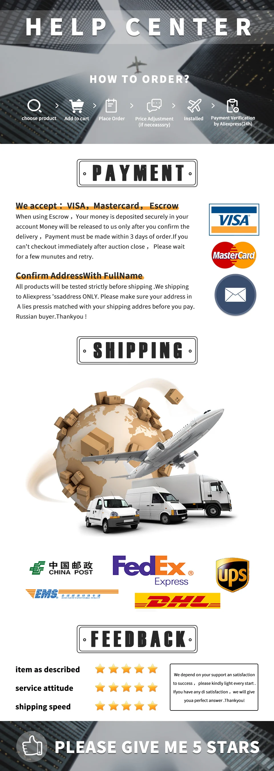 ОтгрузкаПри размещении заказа, пожалуйста, выберите способ доставки и оплатите заказ, включая стоимость доставки (за исключением бесплатной доставки). Мы отправим товар в течение 3 рабочих дней после завершения оплаты.Мы не гарантируем время доставки на все международные поставки из-за различий в сроках таможенного оформления в отдельных странах, что может повлиять на то, как быстро ваш продукт проверяется. Обратите внимание, что покупатели несут ответственность за все дополнительные таможенные сборы, брокерские сборы, пошлины и налоги на импорт в вашу страну. Эти дополнительные сборы могут быть собраны во время доставки. Мы не возмещаем стоимость доставки за отклоненные поставки.Стоимость доставки не включает налоги на импорт, и покупатели несут ответственность за таможенные пошлины.ВозвратМы делаем все возможное, чтобы обслужить наших клиентов по высшему разряду.Мы вернем вам деньги, если вы вернете товар в течение 45 дней с момента получения товара по любой причине. Однако покупатель должен убедиться, что возвращенные товары находятся в их первоначальном состоянии. Если товары повреждены или утеряны, когда они возвращаются, покупатель будет нести ответственность за такой ущерб или потерю, и Мы не дадим покупателю полный возврат средств. Покупатель должен подать иск на транспортную компанию, чтобы возместить стоимость ущерба или убытков.При возврате товара Покупатель несет расходы за обратную доставку.ОтзывыУдовлетворение ваших запросов и положительная обратная связь очень важны для нас. Пожалуйста, оставьте положительные отзывы и 5 звезд, если вы удовлетворены нашими товарами и услугами.Если вы остались недовольны качеством товара и обслуживания, не торопитесь подтверждать получение товара и писать негативный отзыв. Сначала свяжитесь с нами. Мы сделаем все возможное, чтобы решить любые проблемы и предоставить Вам лучшее обслуживание клиентов.Гарантия и техническое обслуживаниеМы предлагаем бесплатную замену в течение 1 месяца (exceptElectrical Компоненты). Покупатели могут запросить замену в течение 15 дней с момента получения товара. Покупатель должен возвратить нам товар в первоначальном состоянии и нести расходы по доставке при возвращении.Перед возвратом товаров, пожалуйста, подтвердите обратный адрес и способ доставки с нами. После того, как товар будет передан компании-перевозчику, пожалуйста, отправьте нам почтовый идентификатор. Как только мы получим товары, мы как можно скорее их отремонтируем или обменяем.