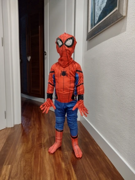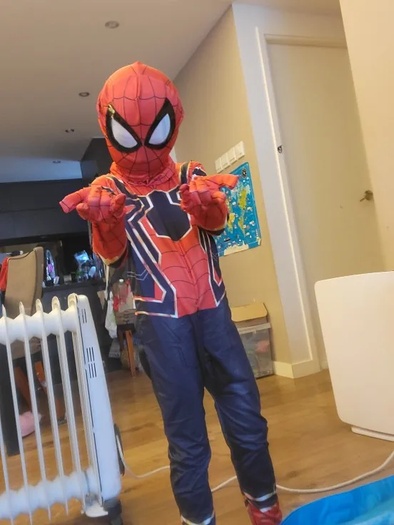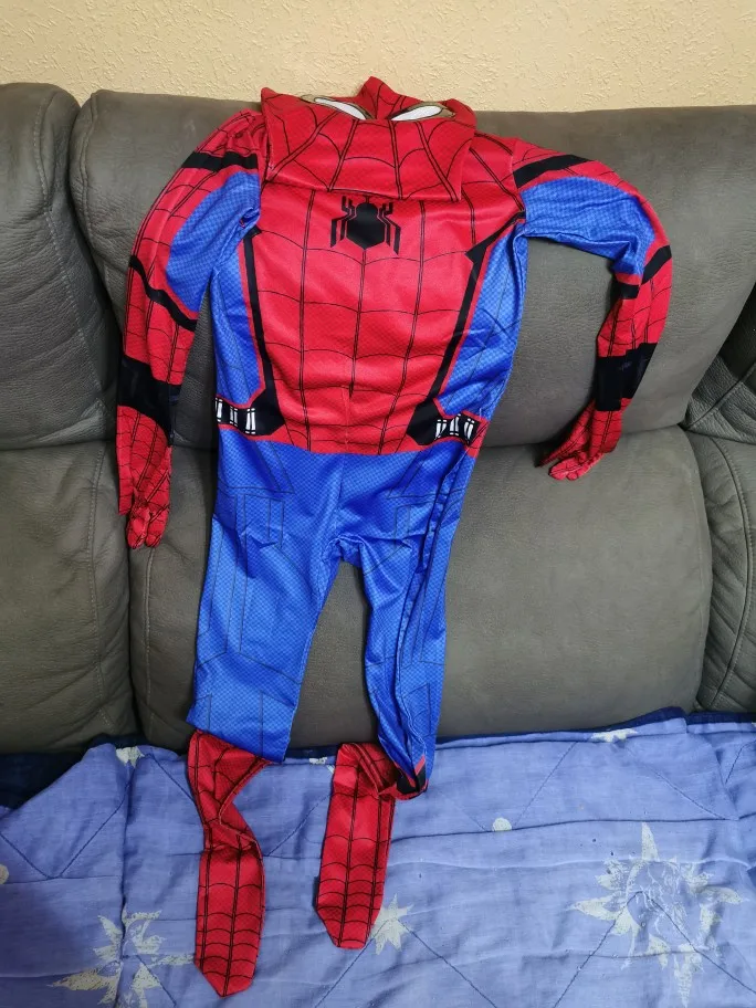 Костюм отличный! Размер 120 см подходит для моего ребенка ростом 112 см, поэтому, возможно, это будет иметь в виду и размер вверх, так как костюм предназначен для всего тела. Я бы хотел добавить антискользящий материал к рукам и ногам, потому что с костюмом мой сын действительно хочет быть супергероем, прыгать и лазить, но он скользкий. Маска-это единственная вещь, которая не подходит так хорошо, задняя часть маски тянет спереди вверх и из-за этого он не может видеть, К сожалению, мы не можем использовать его много, но он любит его. Спасибо продавцу!