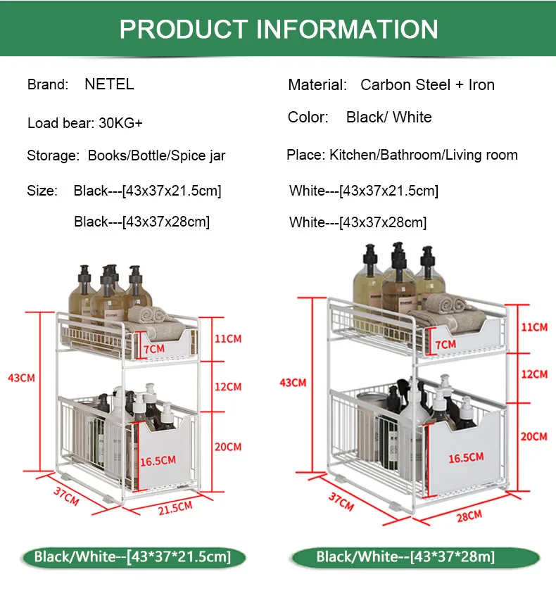 Стеллаж для хранения под раковиной NETEL, 2 яруса, раздвижной шкаф,...