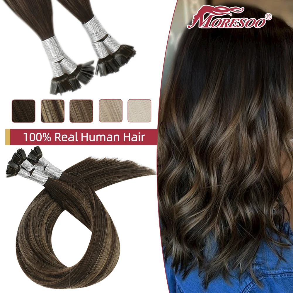 Наращивание Moresoo с плоскими наконечниками, 100% натуральные человеческие волосы, 1 глокон, волосы без повреждений, шелковистые прямые предварительно скрепленные итальянские кератиновые кончики Fusion