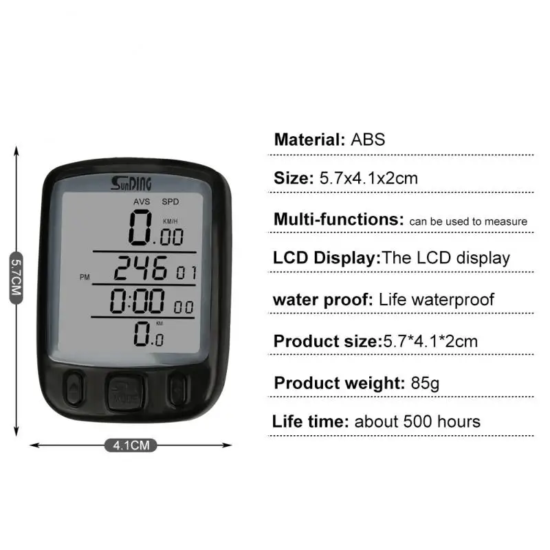 Характеристики: Текущая скорость, общее расстояние вождения, одиночное расстояние вождения, максимальная скорость вождения, средняя скорость вождения, одно время вождения, общее время вождения, часы, секундомер, температура, подсчет времени вождения, время вождения, счетчик дальности движения, обратный отсчет пробега, напоминание о сравнении, напоминание об обслуживании, Напоминание о превышении скорости, Настройка окружности колеса, настройка исходного значения пробега, Общая настройка исходного значения времени вождения, выборка вождения, напоминание о низком заряде батареи, автоматический цикл, функция напоминания о заправке, умный задний светильник, длинный светильник, переключатель