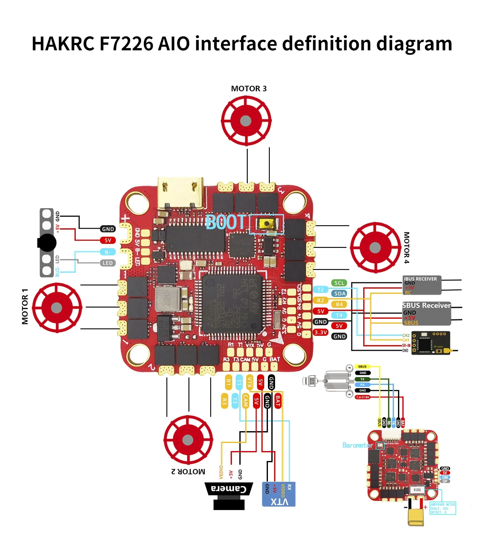 HAKRC F722 40A AIO Ø характеристики продукта:1. PCB принимает high-end 8-слой 2oZ кабель на основе толстого медного кожи, которая имеет сильную сверх-допустимая нагрузка по току и хорошая рассеивания тепла.2. MOS принимает импортные 40V высокое сопротивление тока MOS, длительный срок службы и сильная грузоподъемность. Для 3. Принимает LDO промышленного класса, чтобы противостоять высокой температуре. 4. Принимает высококачественные японские конденсаторы Murata с высокой производительностью фильтрации Размеры: 32*32 мм (25,5mm-26,5mm монтажное отверстие) Размер упаковки: ø63*32 мм Вес нетто продукта: 7 г Вес посылка: 25 г Ø параметры управления полетом:Процессор: STM32F722RET6 IMU: MPU6000 OSD: AT7456E Барометр: интегрированный BEC: 5V/3A Uart: 5 Светодиодный: Поддержка WS2812 и другие программируемые Датчик: Встроенный датчик тока Версия прошивки управления полетом: HAKRC F722D Приемник: CRSF/ Frsky/ Futaba/ Flysky/ TBS Crossfire/ DSMX: приемник DSM2 Ø Параметры ESC:Поддержка прошивки: BLHELI _ S Поддержка протокола: PWM, Oneshot125, Oneshot42, Multishot, Dshot150, Dshot300, Dshot600 Входное напряжение: 2S-6S Lipo Непрерывный ток: 40A Пиковый ток: 50A Измеритель тока пропорциональное значение: 450 Версия прошивки: BLHELI _ S (G- H-30) Упаковочный лист: желтый амортизирующий шар x4, XT30 шнур питания x1, Маленькая Плата USB Type-C x 180 мм длина SH1.0/7P одноголовый кабель x 1, 270 мкФ/35V конденсатор с алюминиевой крышкой x 1