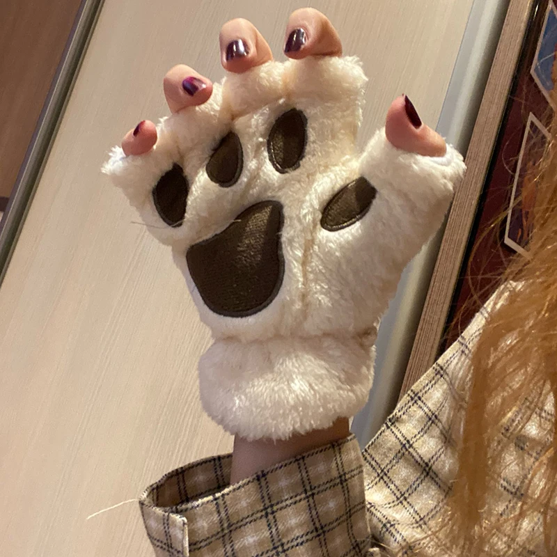 Зимние перчатки без пальцев с милым мультяшным котом для девочек, толстые пушистые перчатки с медвежьими лапами и полупальцами