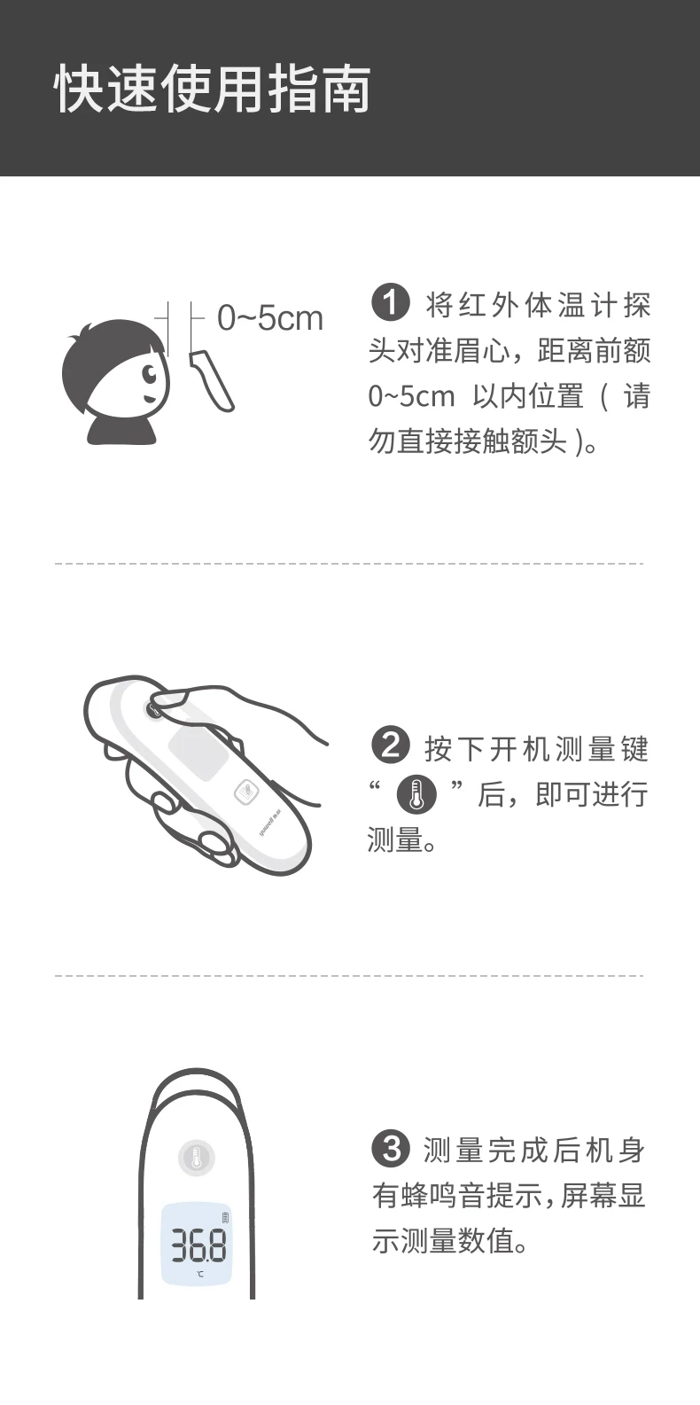 5. Пожалуйста, при измерении Держите лоб чистым и свободным от капель воды.