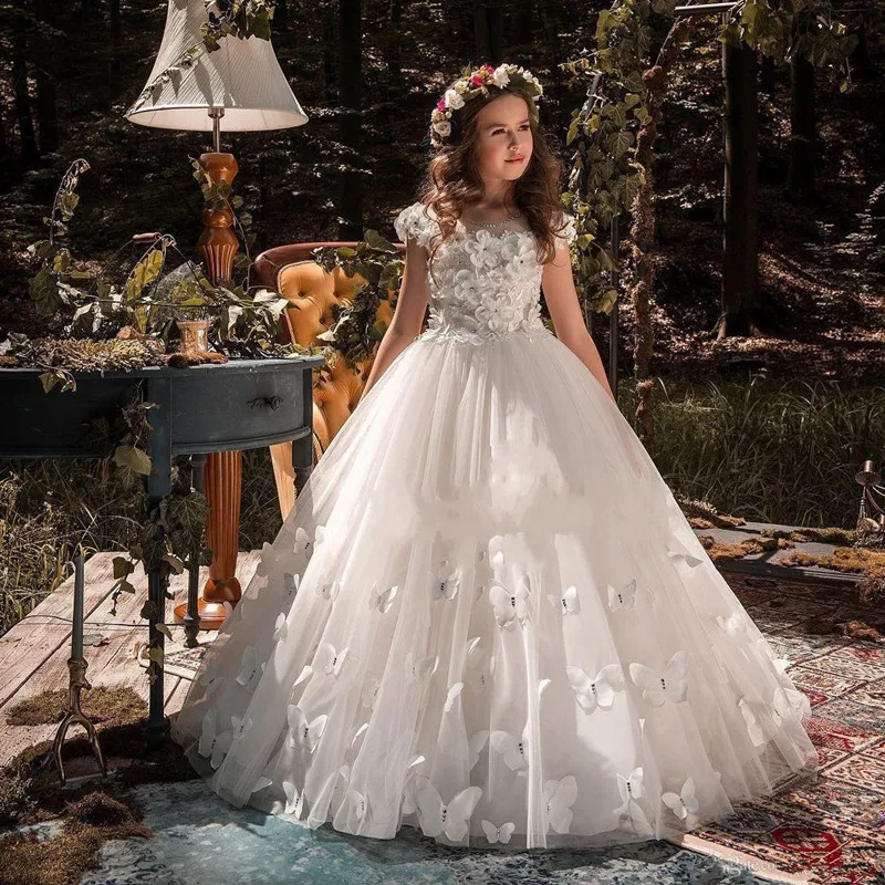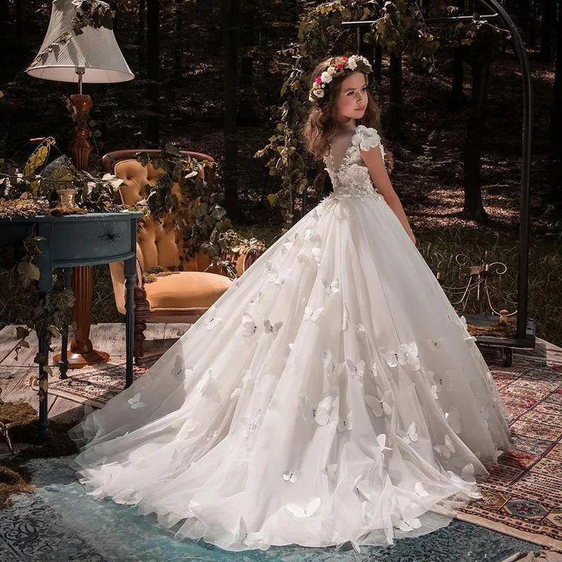 Платье принцессы с аппликацией, Бабочка, цветок, аппликация, для первого причастия, выпускного вечера, для подружки невесты, для свадьбы, со шлейфом, официальное для девушек