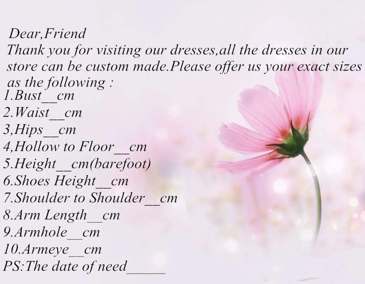 Для платья на заказ, пожалуйста, заполните формат ниже и предложите нам при размещении заказа.Или свяжитесь с нами, мы всегда к вашим услугам.1. Обхват груди: _ см/дюйм2. Талия: _ см/дюйм3. Бедра: _ см/дюйм4. Полый край с каблуком: _ см/дюйм5. Высота каблука: _ см/дюйм6. От плеча до плеча: _ см/дюйм7: длина руки: _ см/дюйм8. Укажите цвет _