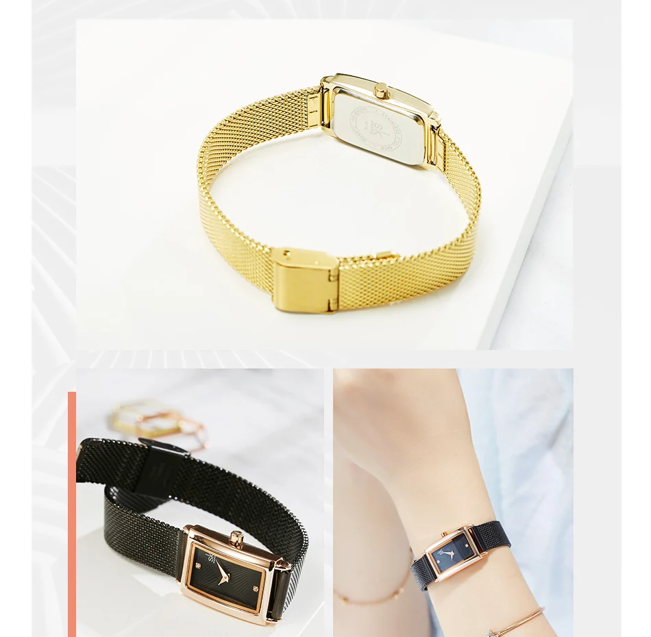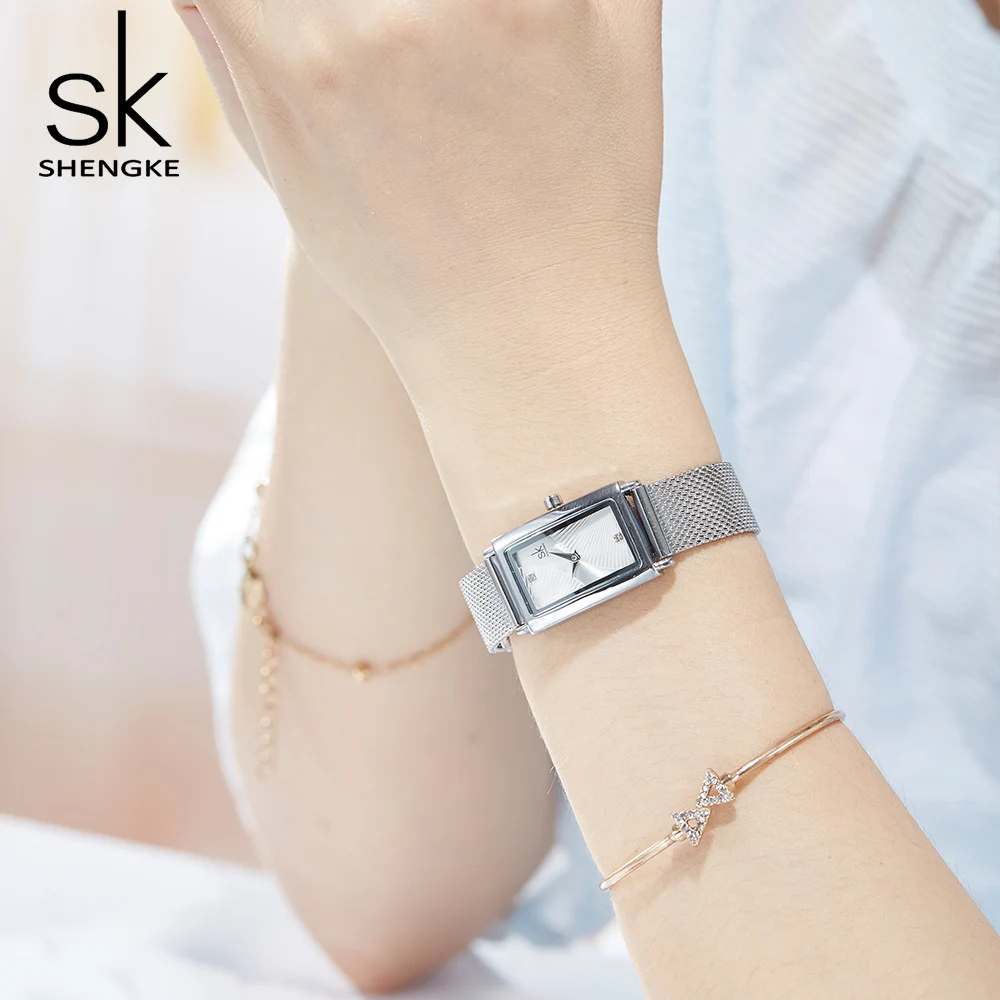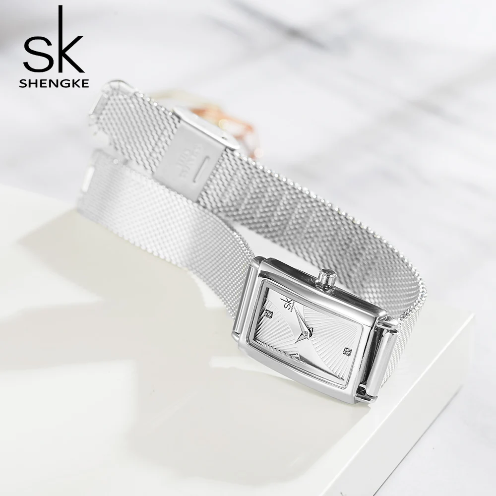 Часы SHENGKE женские с прямоугольным циферблатом, Роскошные Дизайнерские наручные из нержавеющей стали с кристаллами, с сетчатым ремешком