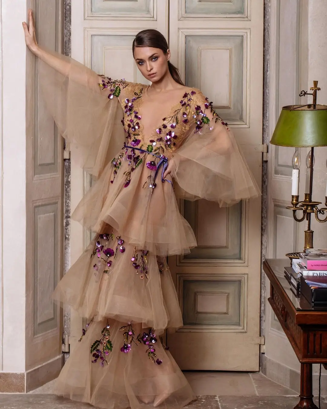 Длинные вечерние платья с открытыми плечами, Цветочное платье с апп...
