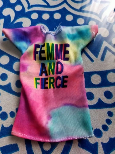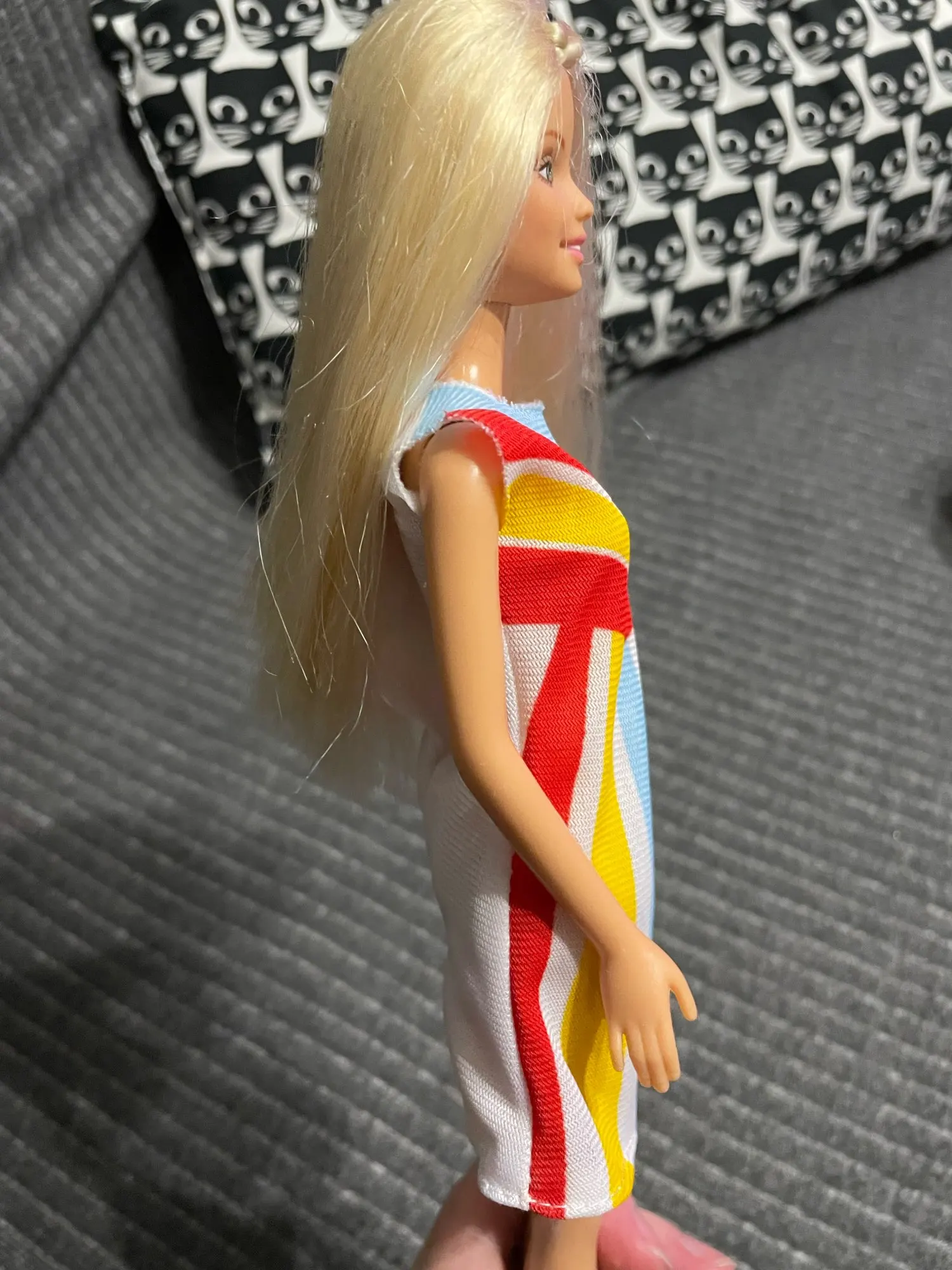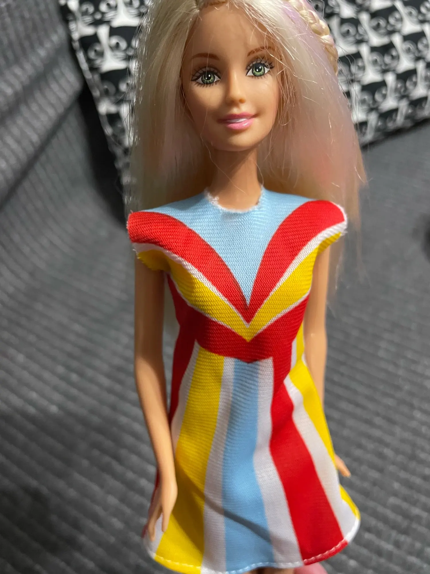 Cute blue dress with a rainbow. I need to sew up the back a bit in order for it to stay on Curvy Barbie, otherwise it will open, especially when she sits down.