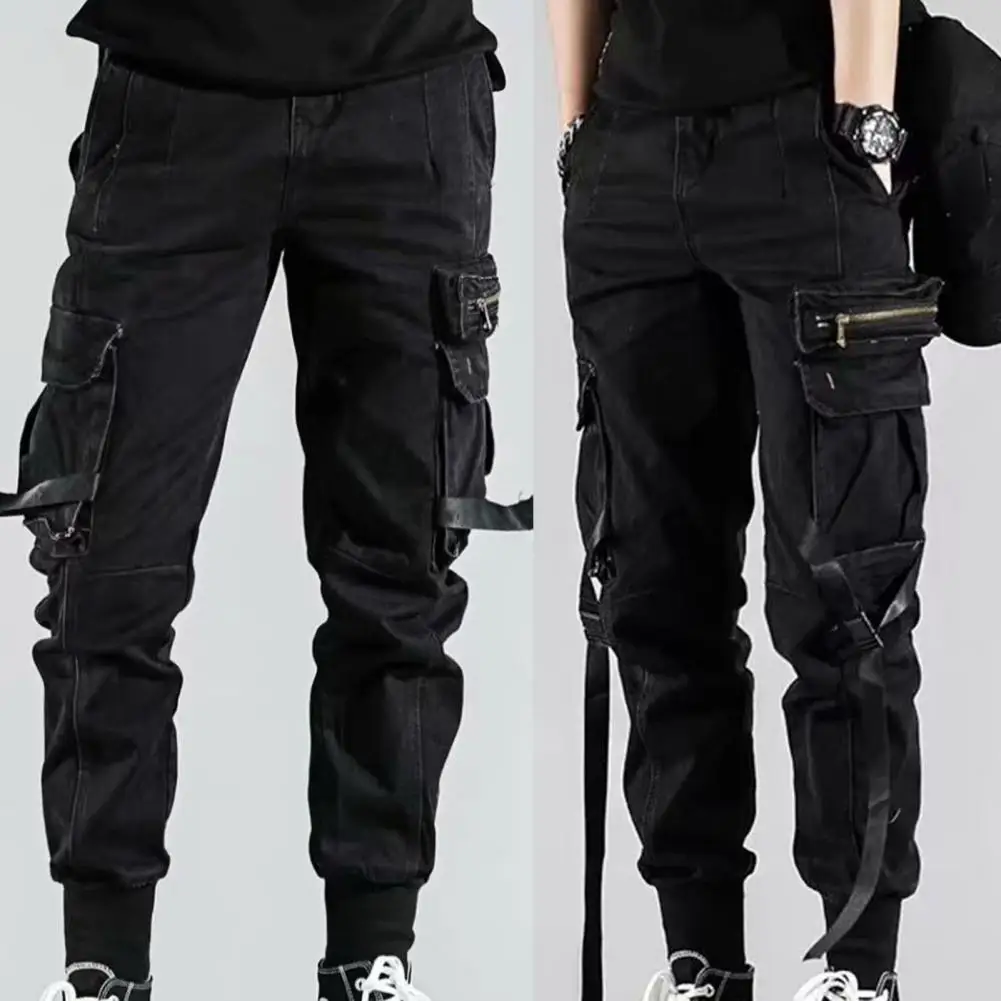 Мужские брюки с карманами, однотонные брюки-карго в стиле хип-хоп, на ремешке, для уличного танца, на осень