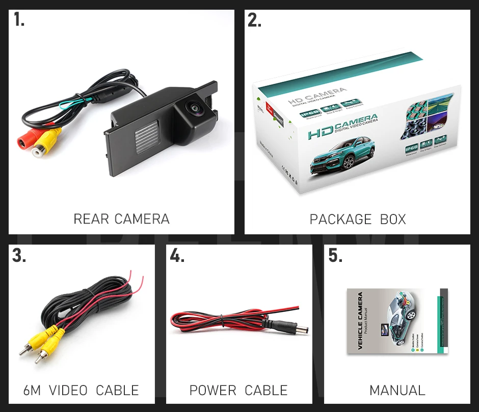 1. Задняя камера2. Коробка для посылка3. Видео кабель (6 м)4. Кабель питания5. Руководство пользователя