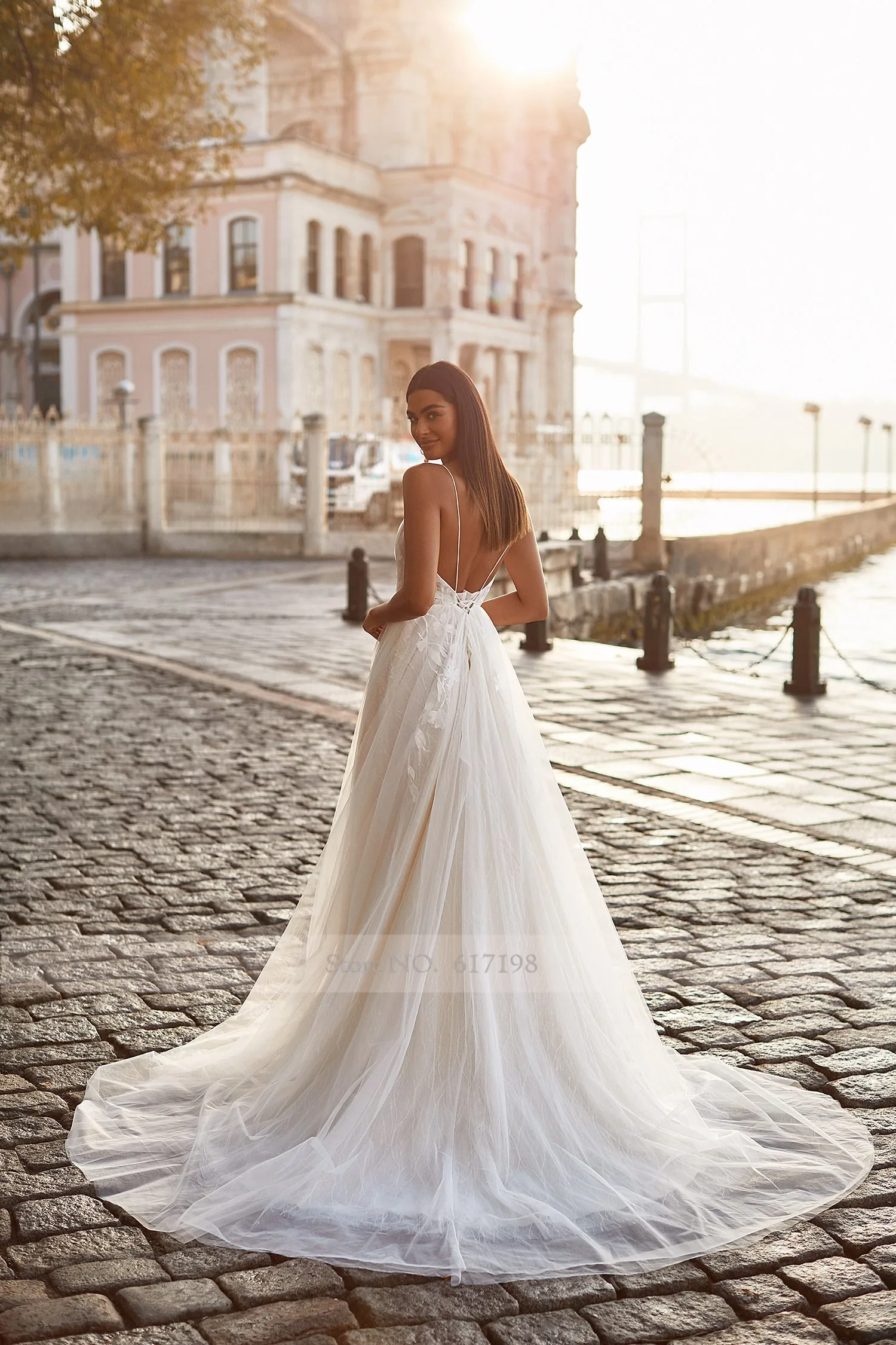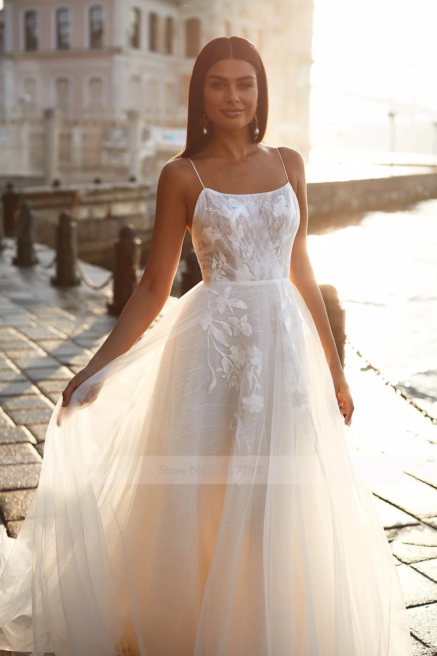 ТРАПЕЦИЕВИДНОЕ свадебное платье из блестящего тюля на тонких бретельках с 3D цветами