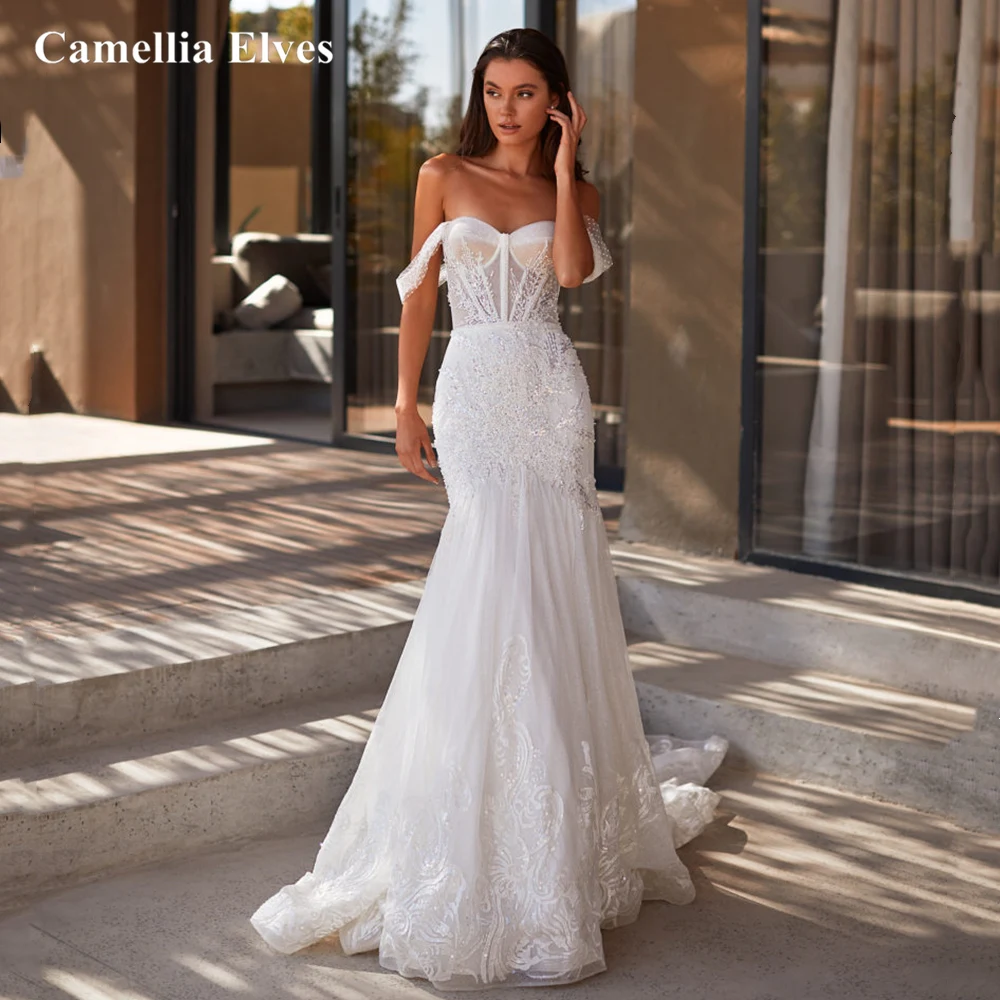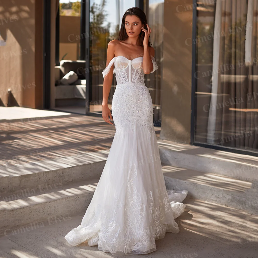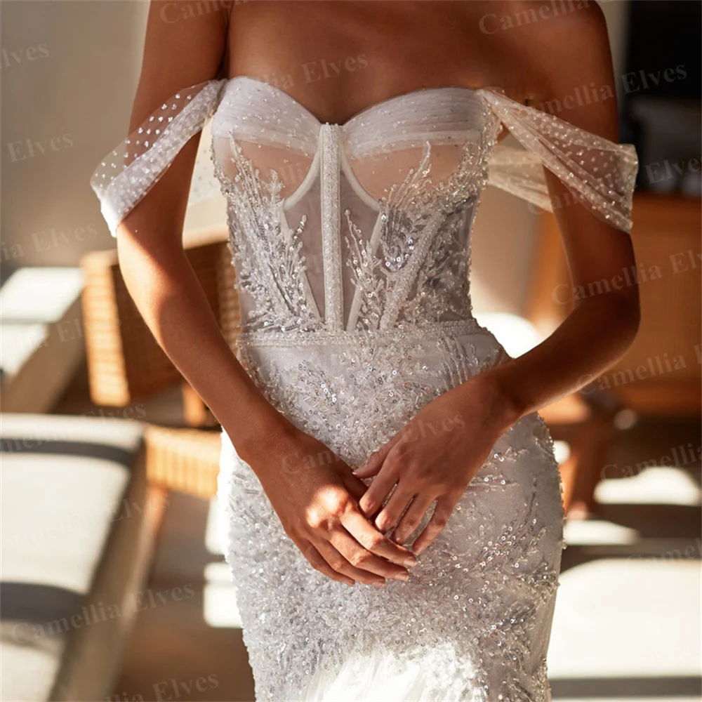 Сексуальные кружевные свадебные платья с открытыми плечами платья-русалки с бисером для невесты с блестками корсет Свадебные халаты со шнуровкой халат для невесты