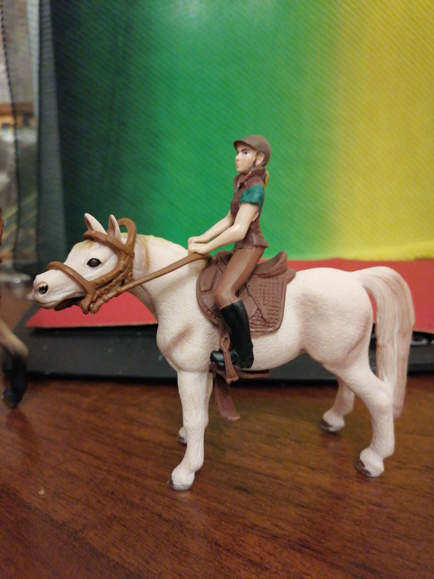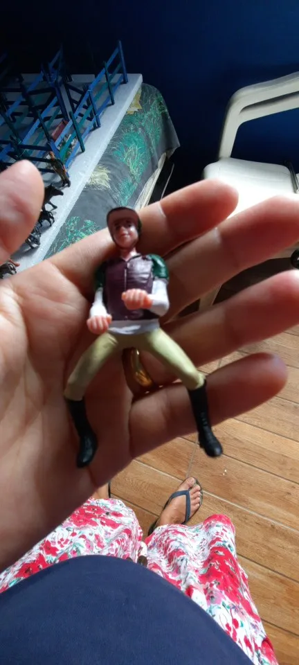Жеребец Appaloosa. Хороший. Отлично окрашен, шерстистый, красивая морда, сделан из пластика. Тяжёленький, как и все остальные. Хорошо село седло и уздечка. Жоккеи на всех лошадках одинаковые по цвету. Мужички в голубых футболках, барышни, в зелёных, наплечниках. Руки только по разному направлены. У мальчиков направо, у девочек налево) Возможно под разных коней. У этого жеребца, правая, задняя не достаёт до поверхности на 2мм. Можно видеть по фото. Стоит на обуви наездника, но стоит устойчиво. Рекомендую для игры детям и в коллекцию любителям.