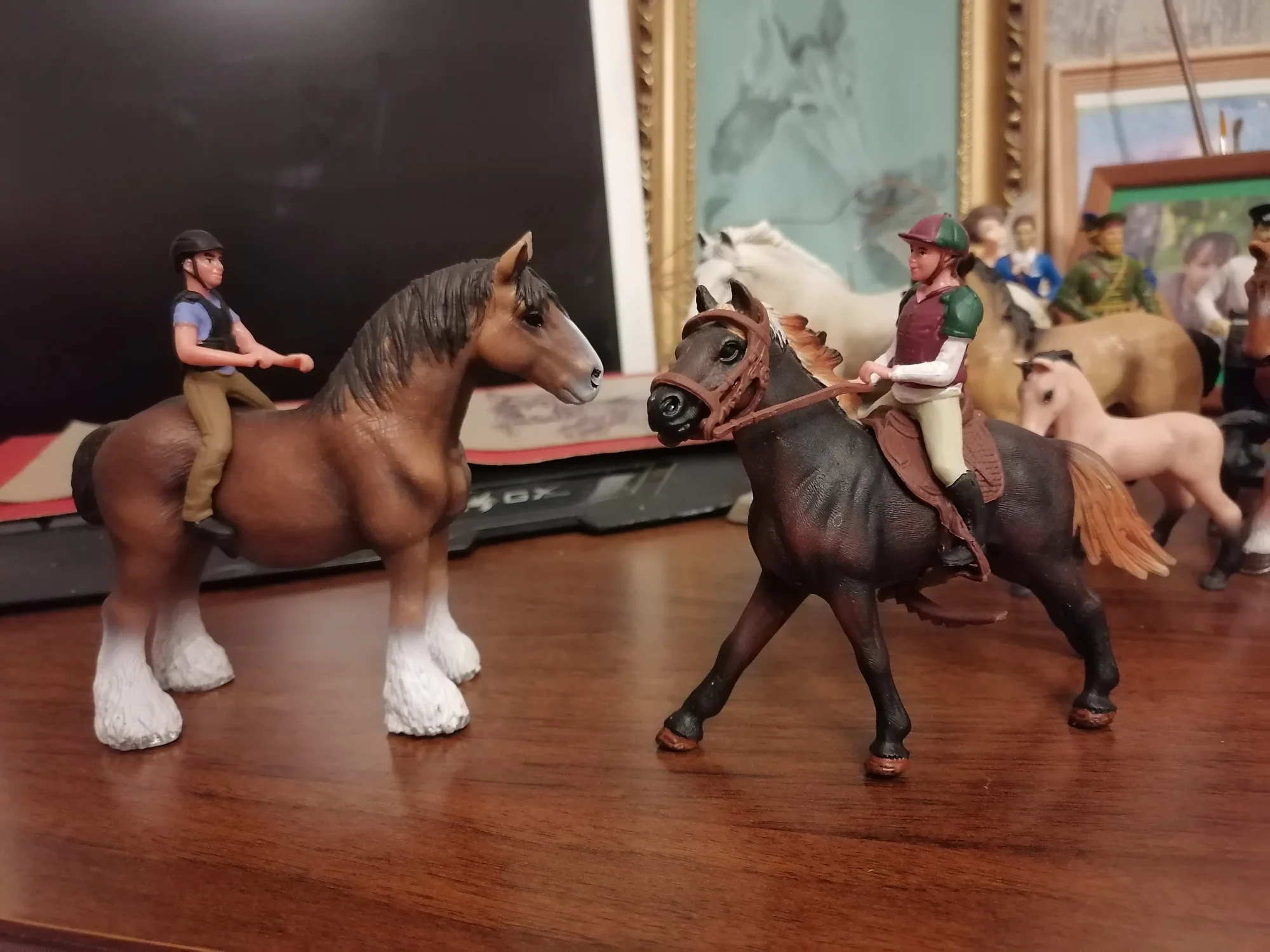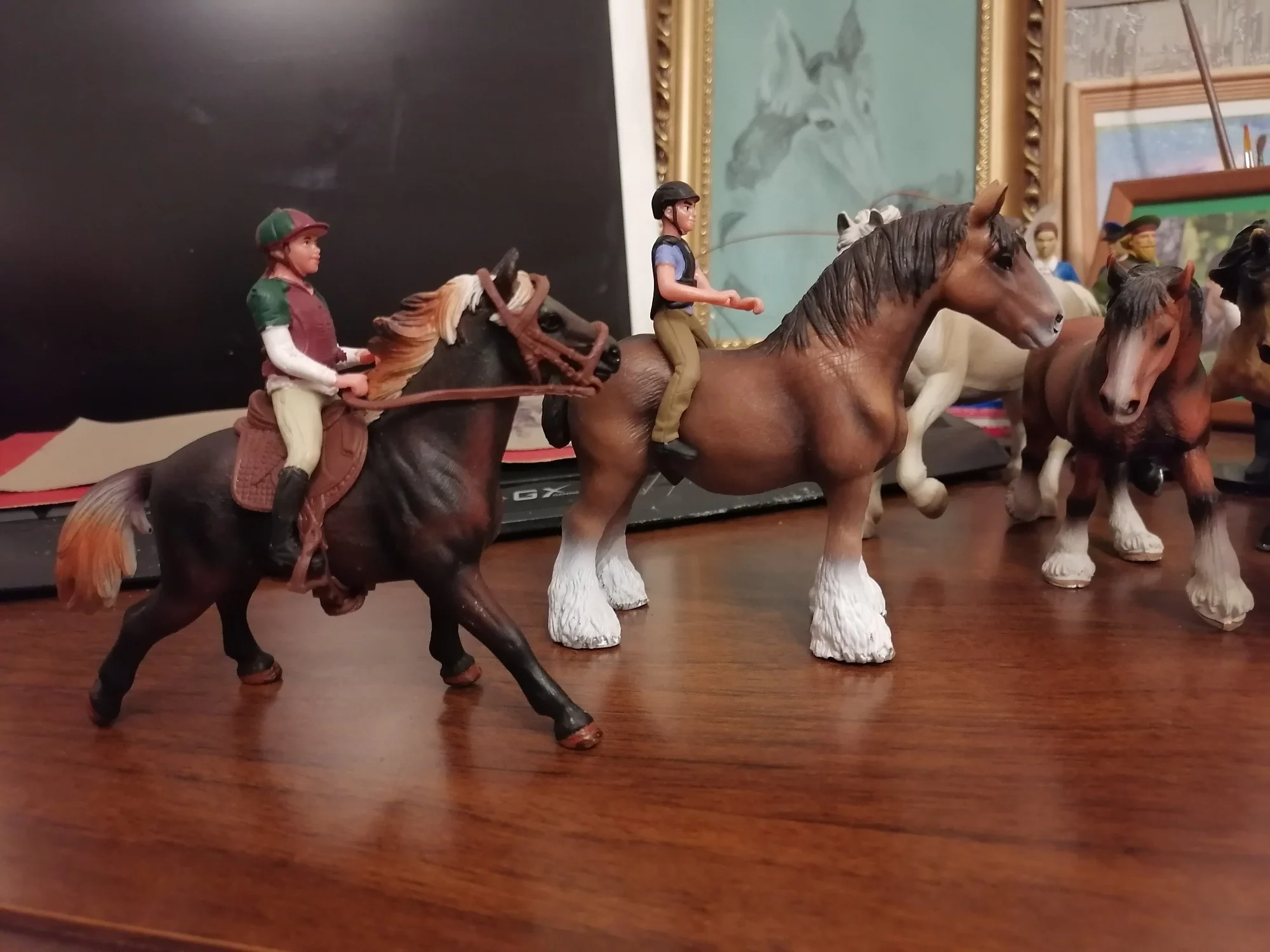 Конь великолепен! У меня теперь вся семья Тинкеров! Сбруя ему совершенно не пошла. Ну да и ладно! В моём табуне много лошадок, кому можно примерить обновку. У седла есть снизу не знаю как правильно назвать, но видимо подклад для комфорта животного. Вот из за этого, седло подошло только пони)) На Тинкере, этот подклад висит на боку)) Поэтому покажу обоих красавцев! Жеребцы все тяжёленькие, выполнены из пластика, олично стоят на поверхности, замечательно окрашены, детально проработаны! Наездники тоже хороши! Рекомендую магазин и продавца!
