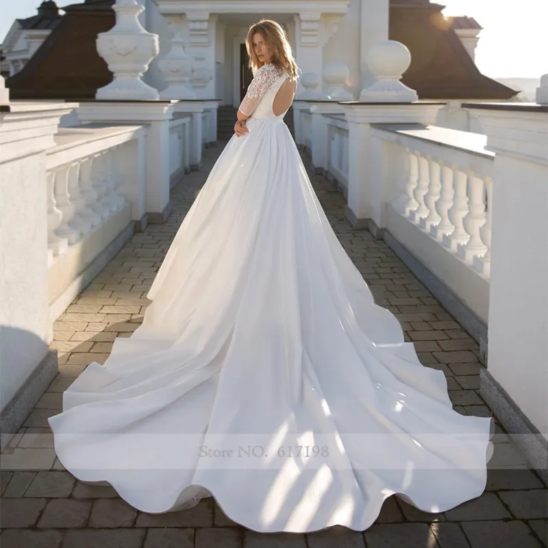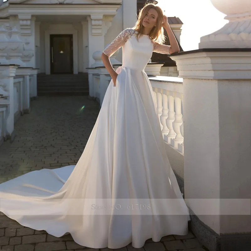 Кружевное свадебное платье-трапеция с аппликацией, круглым вырезом и коротким рукавом
