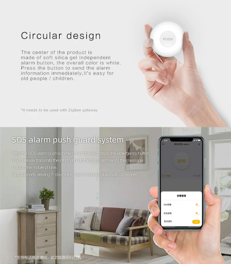 Центр дизайна в форме сада оснащен отдельной кнопкой сигнализации из мягкого силикона. Общий цвет-белый. Нажмите кнопку, чтобы мгновенно отправить сигнал тревоги, который может быть легко использован пожилыми/детьми.