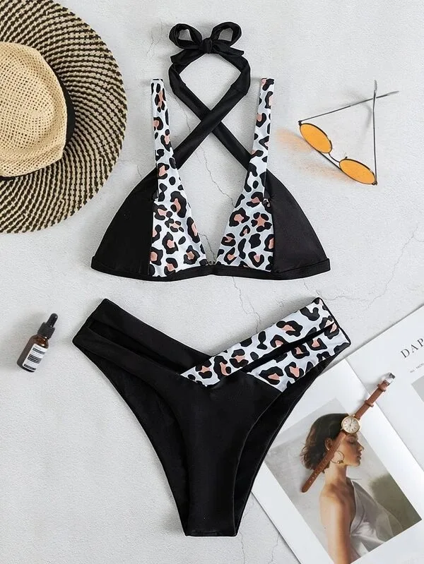 Бикини с высоким вырезом, Леопардовый купальник 2022, женский купальник пуш-ап, женский сексуальный комплект из 2 предметов с лямкой на шее, купальный костюм с принтом, бикини, Новинка