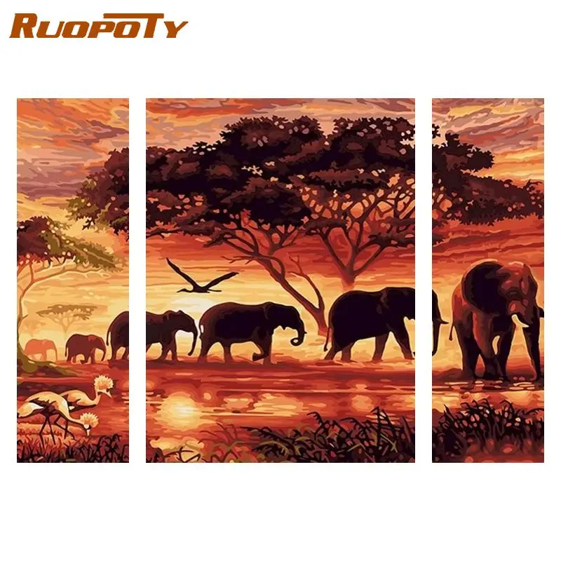 RUOPOTY 3 шт.компл. картина по номерам закат пейзаж Слон холст по номерам Акриловая краска Diy подарок ручная работа для домашнего декора