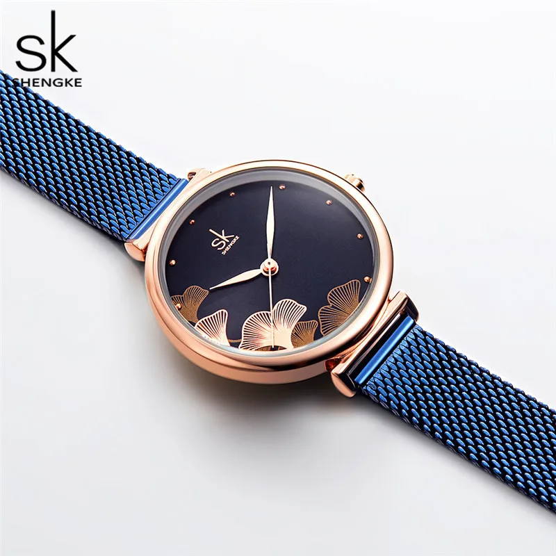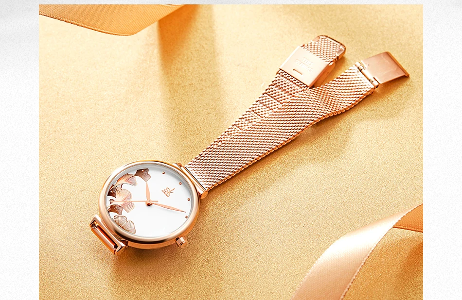 Часы Shengke с рисунком листьев гинкго, женские Роскошные наручные часы из розового золота, модные женские часы с сетчатым ремешком, распродажа, подарок, reloj