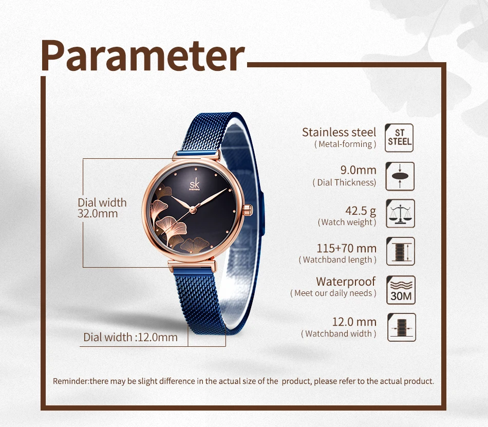 РазмерыДлина ремешка: 18,5 смДиаметр циферблата: 3,2 смТолщина циферблата: 0,9 смШирина ремешка: 1,2 смВодонепроницаемость, не для плавания, дайвинга или купания.
