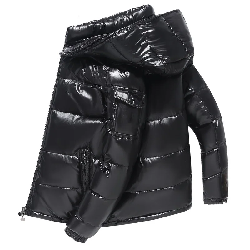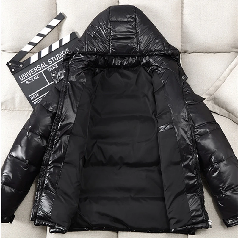 Мужская теплая куртка, блестящее зимнее пальто, капюшон на белом ут...