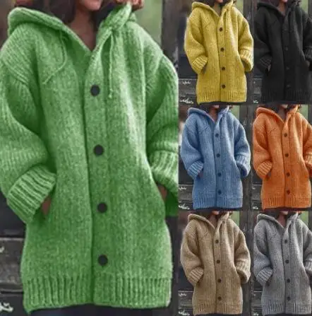 Зимний женский кардиган, повседневный однотонный вязаный свитер с капюшоном на пуговицах, пальто, Теплый Женский трикотажный кардиган с длинным рукавом, верхняя одежда