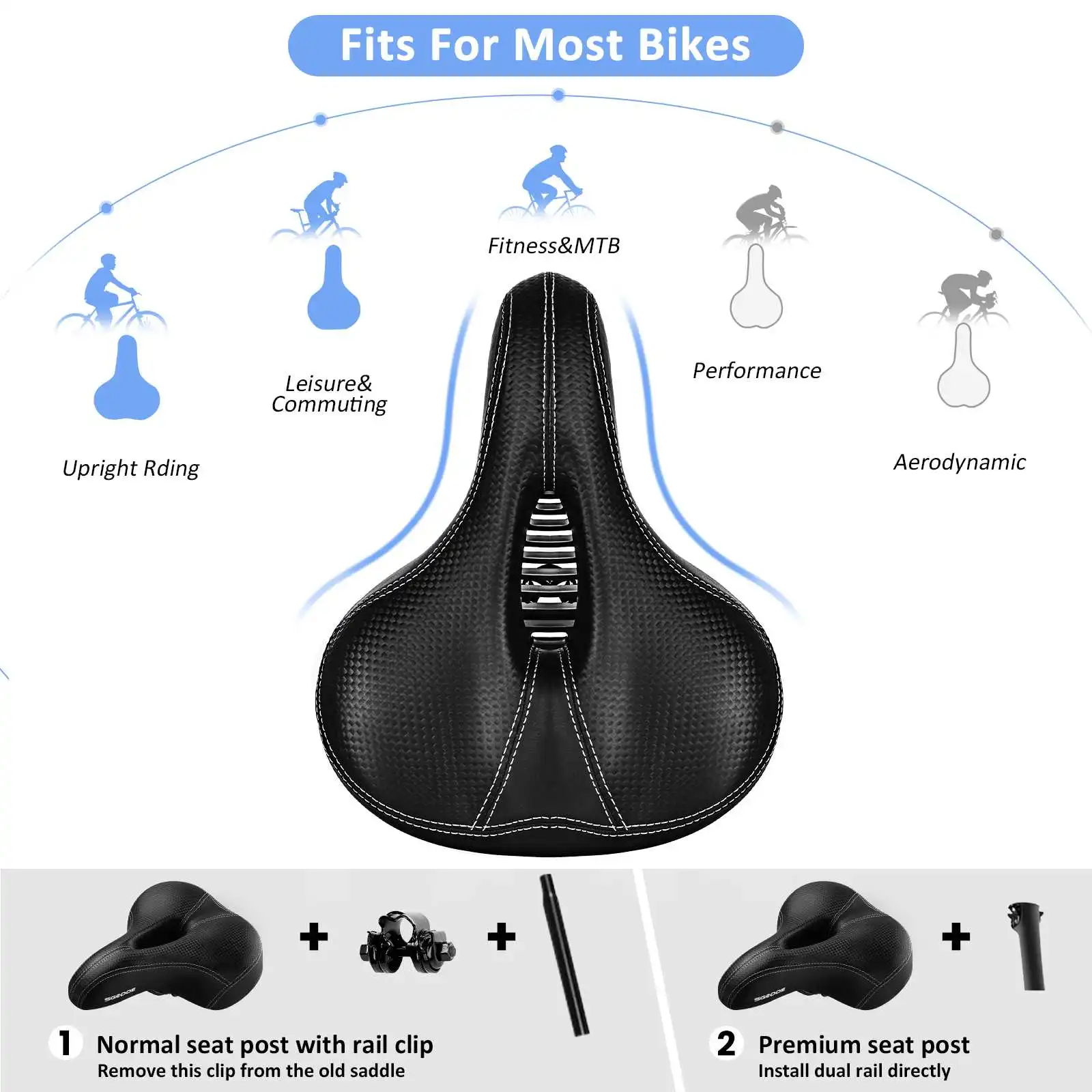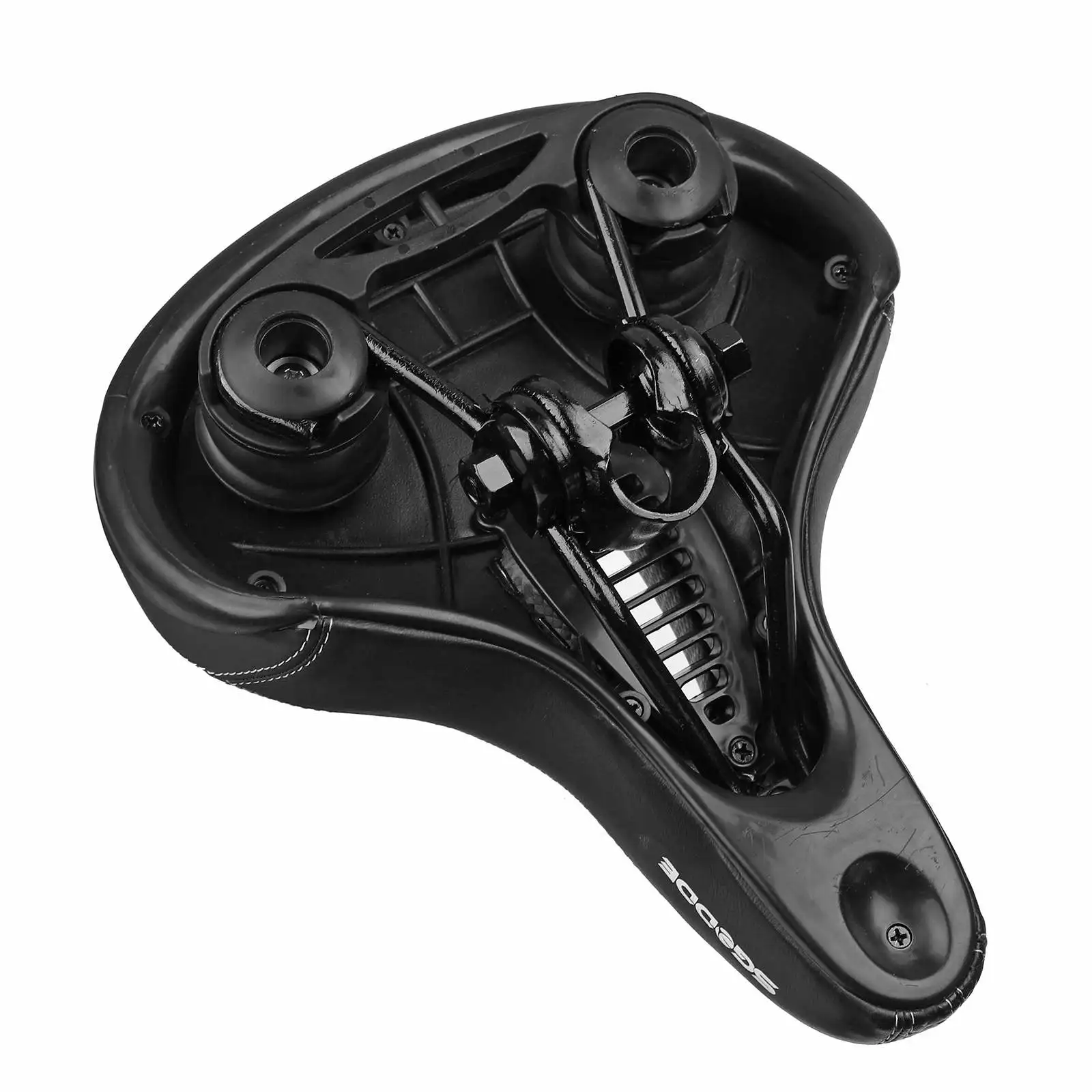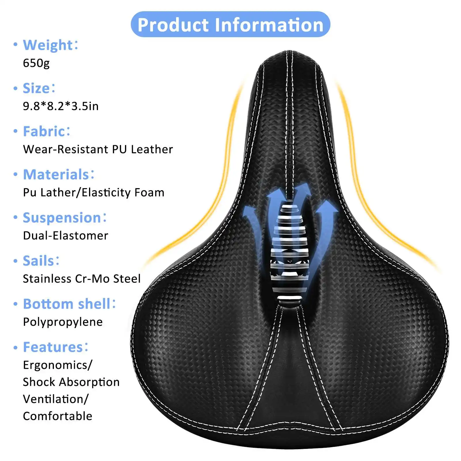 2. Двойная пружина подвески-Амортизация, помогает сгладить удары, лучший выбор для езды на дальние расстояния! Более того, это большое Велосипедное Сиденье имеет средний паз дышащего дизайна, вентилируемый, может уменьшить ощущение затхлости, всегда сохраняет прохладу и сухость, хорошо для личных частей!