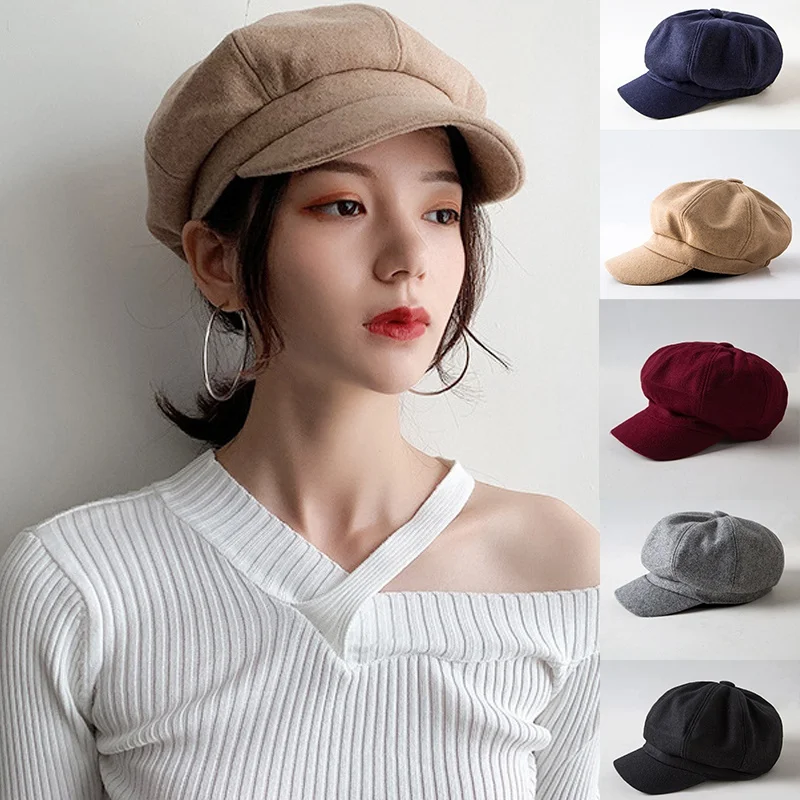 Осенние Зимние шапки для женщин однотонная простая восьмиугольная кепка газетчика для мужчин и женщин Повседневная шерстяная шапка Зимний берет Женская кепка художника