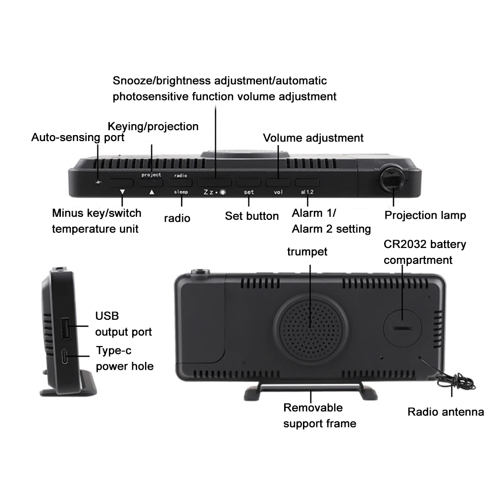 1. Проекция времени, идеальный будильник для спальни, часы будут проецированы на потолок или стену в мягком красном цвете, угол проекции и яркость можно регулировать, И он может быть перевернут на 180 градусов, чтобы получить лучший эффект просмотра. С дисплеем температуры и влажности в помещении (температура и влажность не могут быть проецированы), обеспечить наиболее точное значение измерения, дайте вам знать, нужно ли вам настроить.