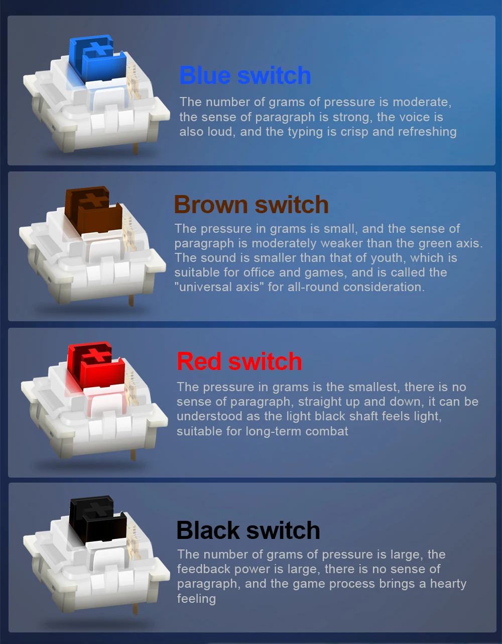 Черный переключательОбщий ход: 3,00 ммНа ход: 1,20 ± 0,5 ммСила проводимости: 55 ± 10gfМинимальная сила срабатывания: 50 ГФ минСила прерывания: 80 gf MaxКоличество граммов давления большое, отзывы о мощности большие, нет чувства абзаца, и игровой процесс приносит сердечное ощущение.