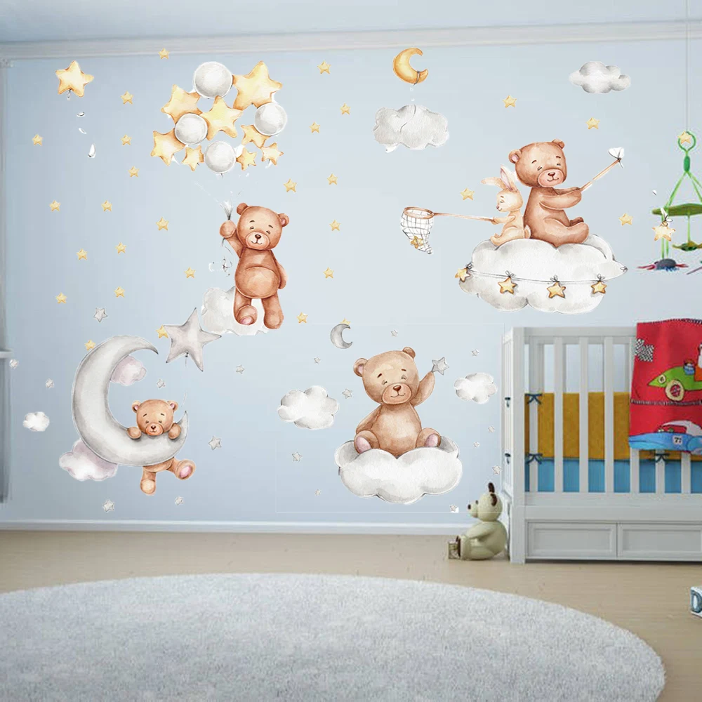 Наклейки на стену с мультяшным медведем, звездами, луной, облаками,...