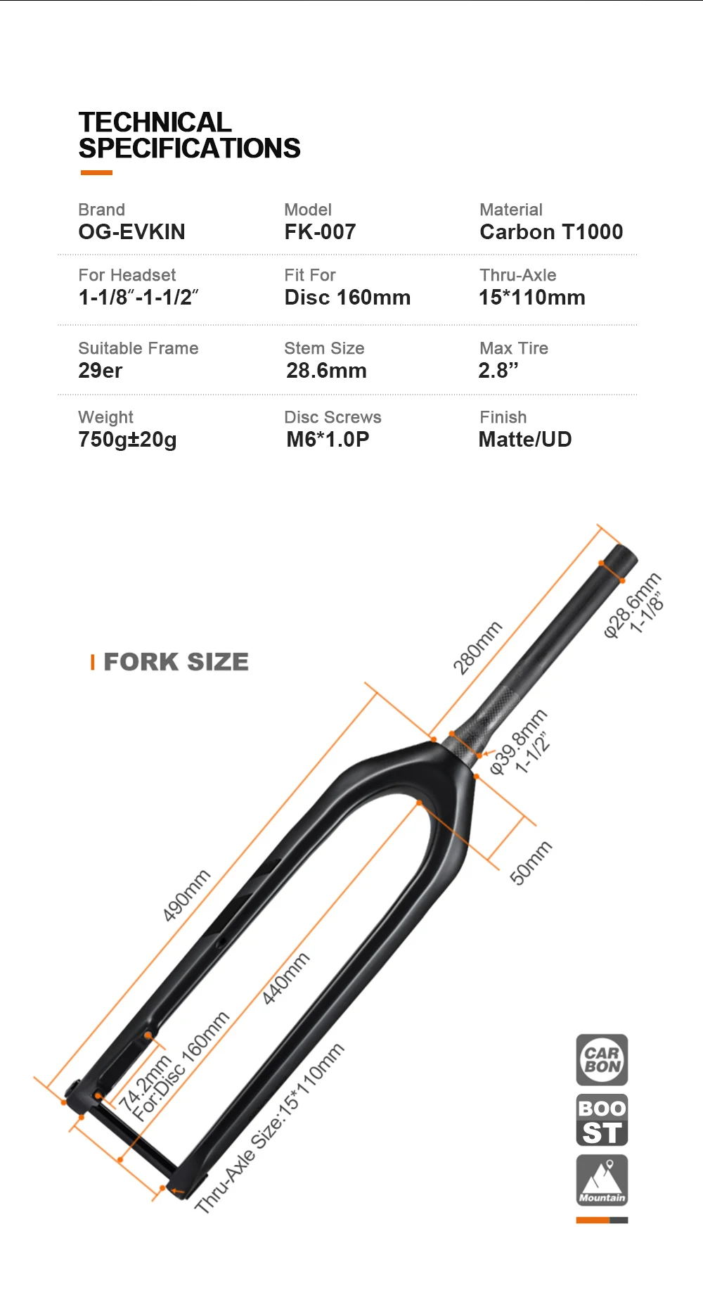 OG-EVKIN FK-007 29er Thru Axle 15x110 мм Boost Carbon передняя вилка для горных велосипедов 1-18 дюйма-1-12 дюйма Вилка для горного велосипеда