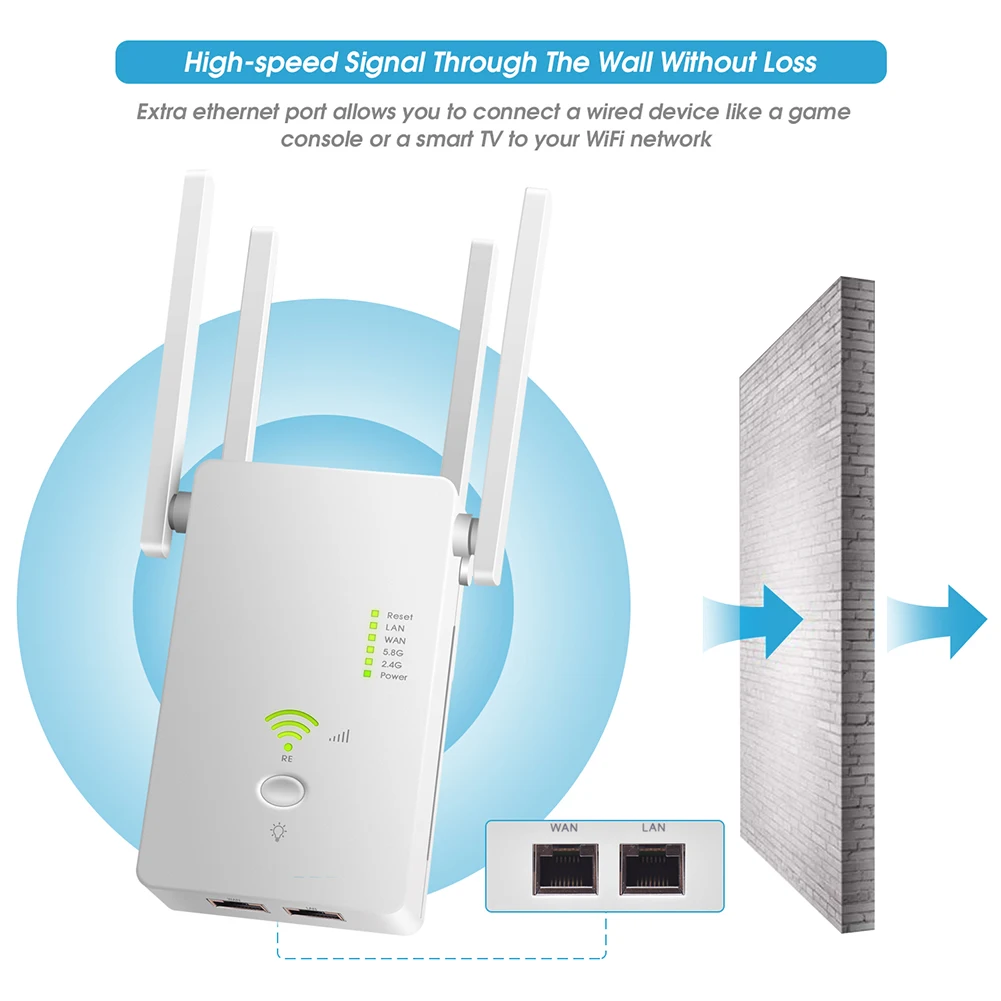 Двухдиапазонный диапазон 1200 Мбит/с, поддержка 2,4G и 5,8G Dual Band без потери сигнала через стену, сильный сигнал легко проникает в стены,