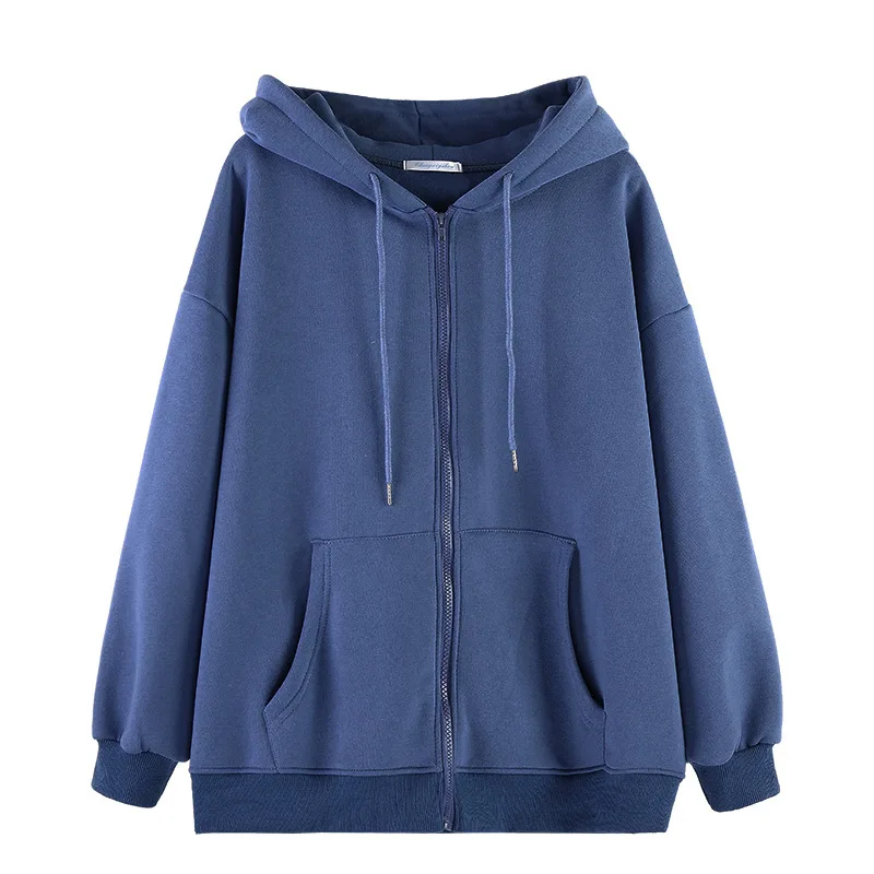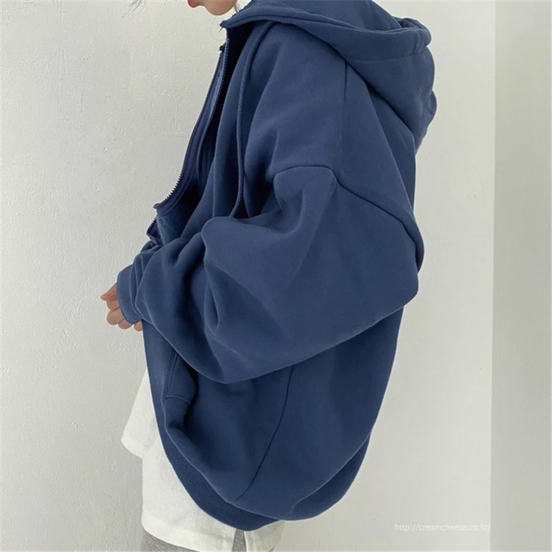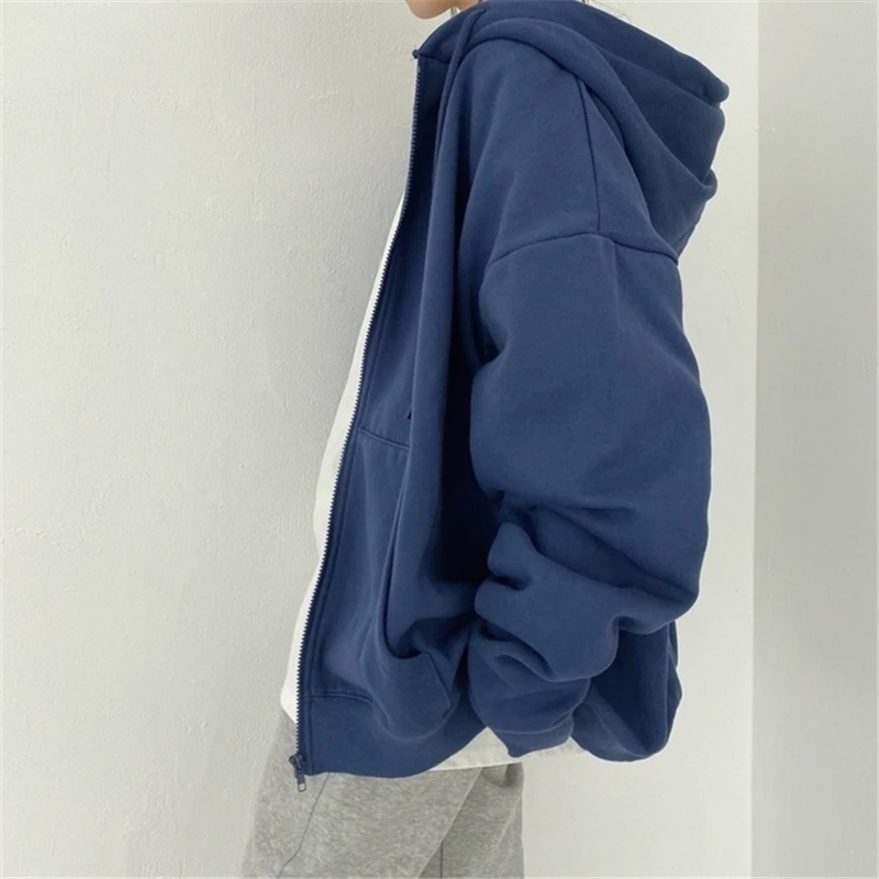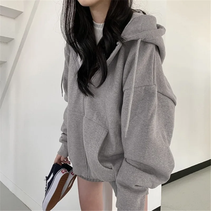 Женские толстовки большого размера 2021, повседневные однотонные куртки на молнии с длинным рукавом, Корейская версия, Свободные флисовые толстовки в стиле Харадзюку С Капюшоном