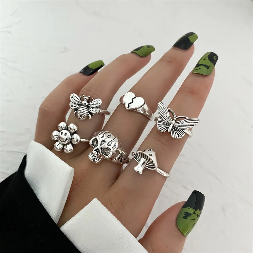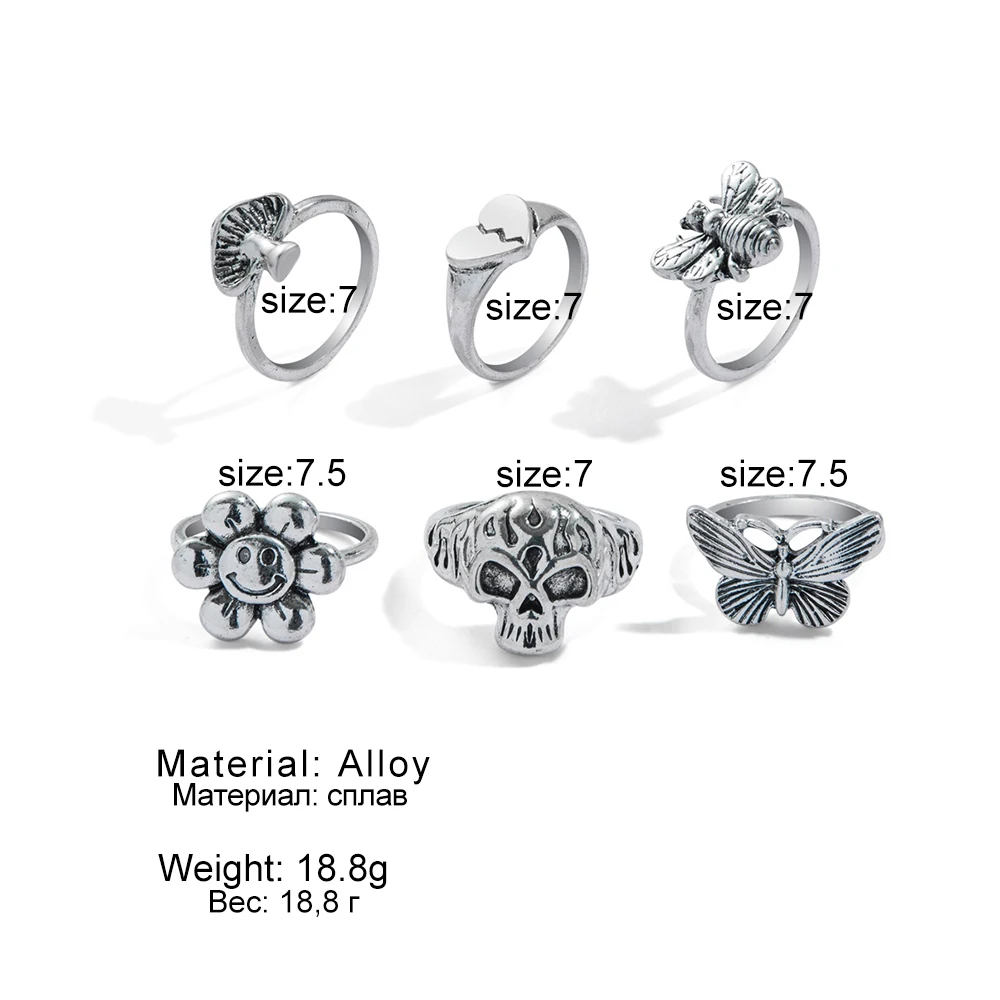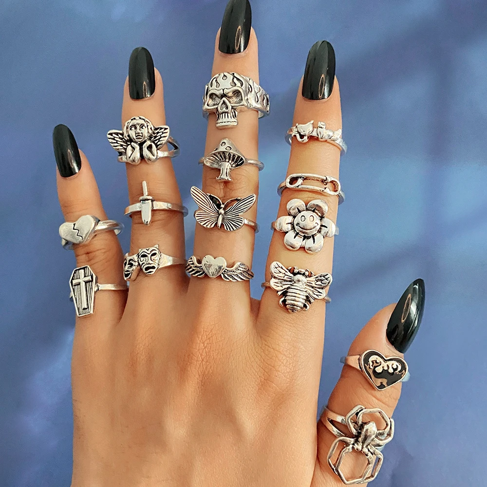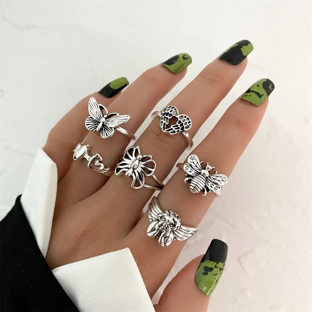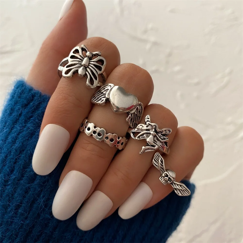 Винтажное посеребренное кольцо с крыльями ангела для женщин, готический панк, стимпанк, сердце, бабочка, кольцо с черепом, комплекты ювелирных изделий для вечеринки, 2021