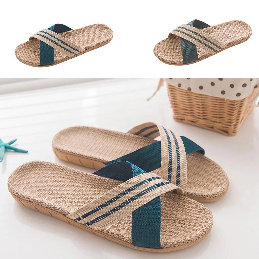 Мужские Нескользящие шлепанцы для ванной комнаты, льняные домашние тапочки с открытым носком, плоская подошва, пляжные тапочки, обувь для душа # V30