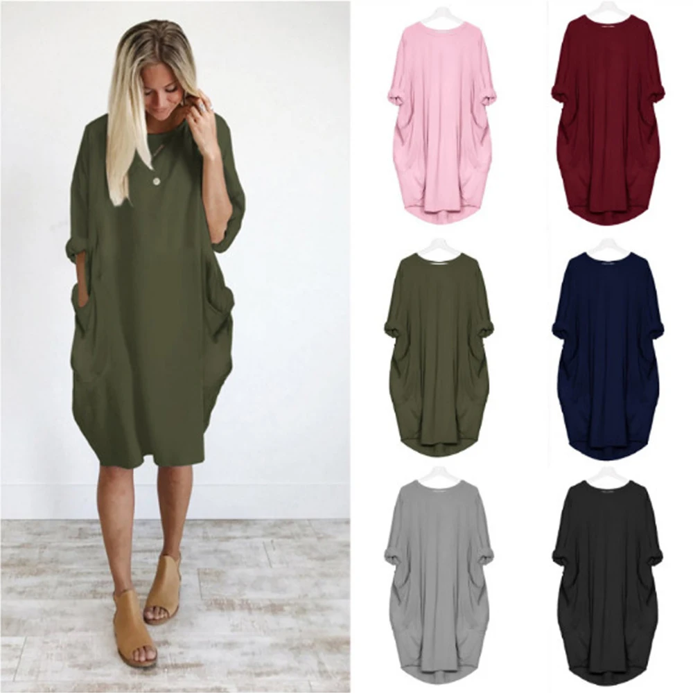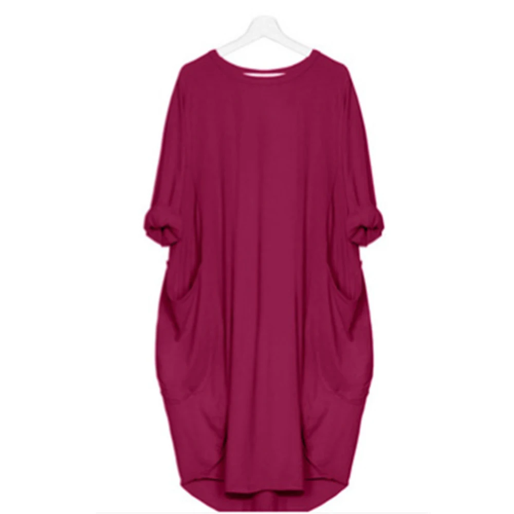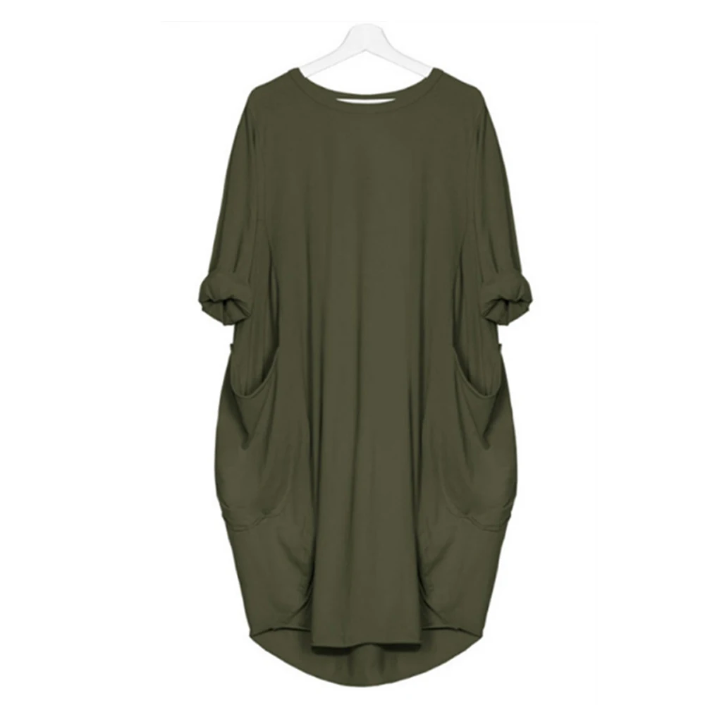 Осенние однотонные платья для женщин 2021 Весна свободного размера плюс 5XL с длинным рукавом Vestidos карманы повседневное Черное Платье До Колена