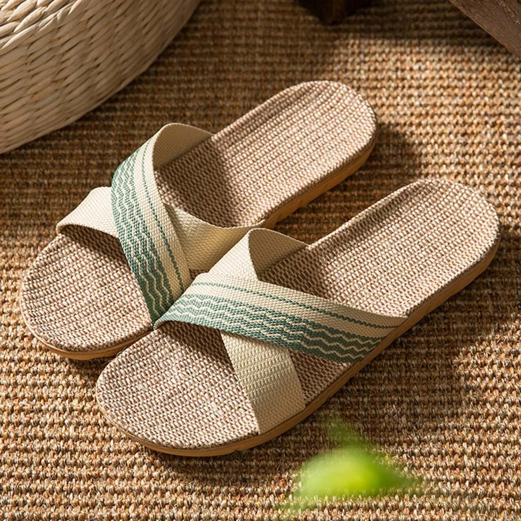 Женские летние тапочки; Домашние тапочки для пар; Льняные Повседневные тапочки с перекрестными ремешками