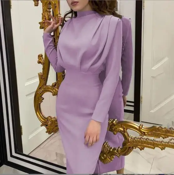 Элегантное женское платье, Осеннее облегающее однотонное платье до щиколотки с воротником-стойкой и высокой талией, офисное женское плиссированное платье